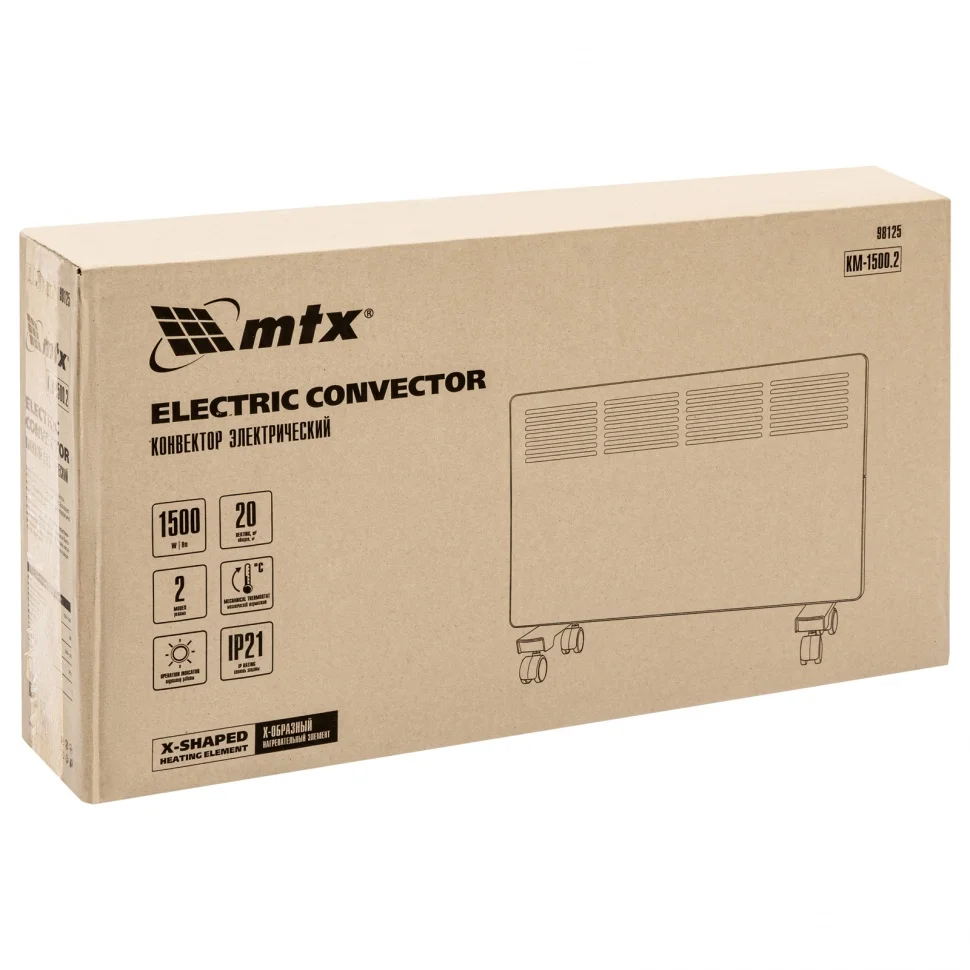 Конвектор электрический MTX KM-1500.2 98125 с X-образным нагревателем, колесами и термостатом, мощностью 1500 Вт, предназначен для использования в закрытых помещениях: квартирах, офисах, на производствах, в общественных местах и т.д. Рекомендуемая площадь обогрева составляет 20 кв.м. Х-образный нагревательный элемент обеспечивает быстрый и равномерный прогрев помещения до необходимой температуры, при этом не сушит воздух.