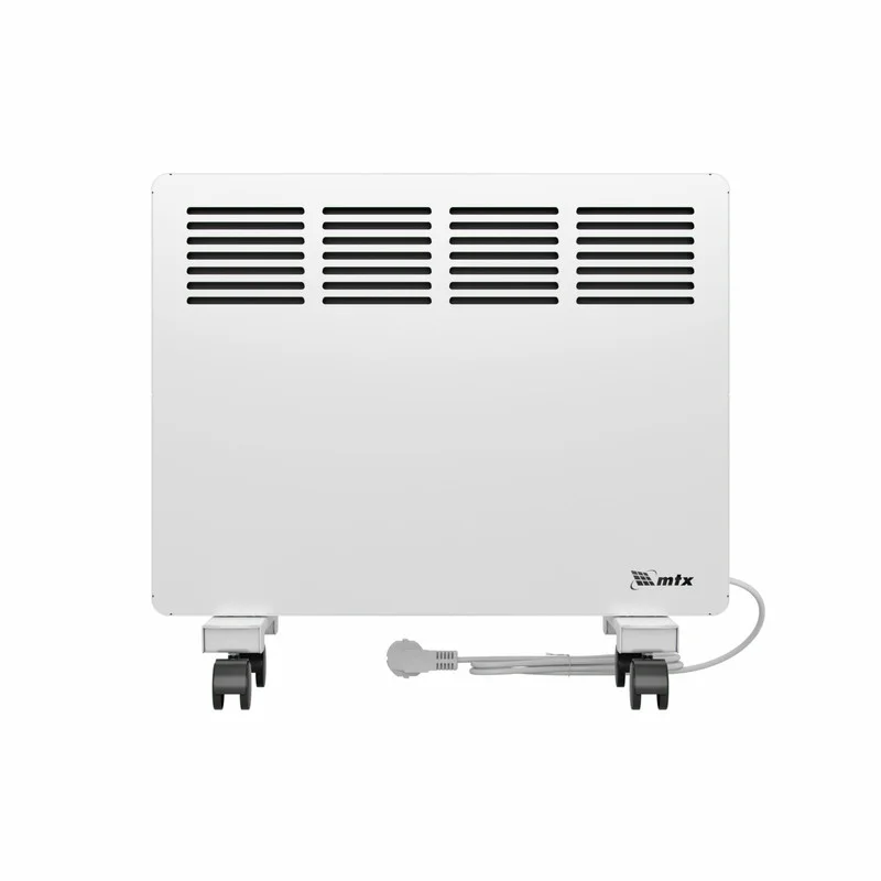 Конвектор электрический MTX KM-1000.1 98124 с X-образным нагревателем, колесами на металлической опоре и термостатом, мощностью 1000 Вт, предназначен для использования в закрытых помещениях: квартирах, офисах, загородных домах, на даче, на производстве и в общественных местах. Рекомендуемая площадь обогрева составляет 15 кв.м. Х-образный нагревательный элемент обеспечивает быстрый и равномерный прогрев помещения до необходимой температуры, при этом не сушит воздух.ПреимуществаВсе выполнено из металла — корпус, колесные опоры, крепежная рамка.Премиум дизайн — глянцевая лицевая панель конвектора хорошо вписывается в интерьер.Антивандальное покрытие «Белая шагрень» — имеет в 3 раза выше прочность относительно обычной краски.Оптимальная циркуляция воздушного потока — внутри конвектора установлен специальный отражающий экран, рассчитанный согласно законам термодинамики.Термозащита — конвектор отключается в случае перегрева, что делает его использование безопасным и предотвращает выход из строя.Удобная настройка и автоматическое поддержание заданных параметров — механический термостат позволяет задать и точно поддерживать температуру в помещении.Комфортная эксплуатация — конвектор не сушит воздух и не сжигает пыль, что исключает появление неприятного запаха в помещении.Надежность и долговечность — Х-образный нагревательный элемент отличается самым большим сроком службы в сравнении с другими нагревательными элементами и обеспечивает равномерную конвекцию без риска локальных перегревов.Возможность использования в ванной комнате — нагревательный элемент выдерживает эксплуатацию в условиях повышенной влажности.Мобильность — колеса облегчают перемещение обогревателя.Два варианта монтажа — конвектор можно расположить на полу или повесить на стену (колесные опоры и кронштейн входят в комплект поставки).Цельнометаллическая крепежная рамка — облегчает монтаж конвектора на стену и повышает жесткость конструкции.