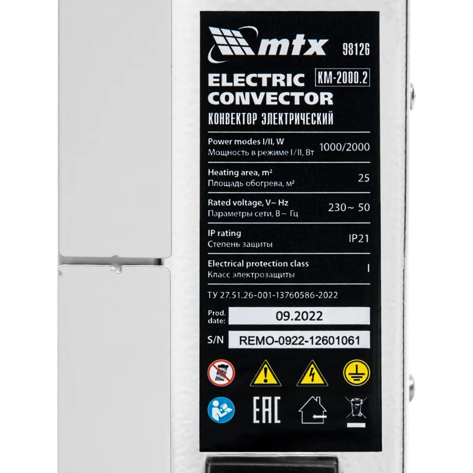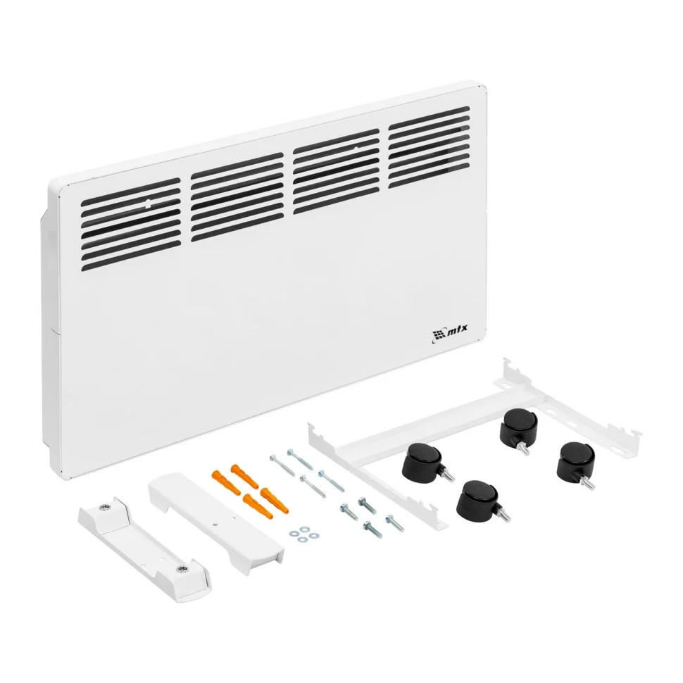 Конвектор электрический MTX KM-2000.2 98126 с X-образным нагревателем, колесами на металлической опоре и термостатом, мощностью 2000 Вт, предназначен для использования в закрытых помещениях: квартирах, офисах, загородных домах, на даче, на производстве и в общественных местах. Рекомендуемая площадь обогрева составляет 25 кв.м. Х-образный нагревательный элемент обеспечивает быстрый и равномерный прогрев помещения до необходимой температуры, при этом не сушит воздух.Преимущества2 режима работы (полный обогрев на мощности 2000 Вт и частичный на 1000 Вт) — конвектор позволяет прогревать холодное помещение и поддерживать тепло в отапливаемом.Все выполнено из металла — корпус, колесные опоры, крепежная рамка. Премиум дизайн — глянцевая лицевая панель конвектора хорошо вписывается в интерьер.Антивандальное покрытие «Белая шагрень» — имеет в 3 раза выше прочность относительно обычной краски.Оптимальная циркуляция воздушного потока — внутри конвектора установлен специальный отражающий экран, рассчитанный согласно законам термодинамики.Термозащита — конвектор отключается в случае перегрева, что делает его использование безопасным и предотвращает выход из строя.Удобная настройка и автоматическое поддержание заданных параметров — механический термостат позволяет задать и точно поддерживать температуру в помещении.Комфортная эксплуатация — конвектор не сушит воздух и не сжигает пыль, что исключает появление неприятного запаха в помещении.Надежность и долговечность — Х-образный нагревательный элемент отличается самым большим сроком службы в сравнении с другими нагревательными элементами и обеспечивает равномерную конвекцию без риска локальных перегревов.Возможность использования в ванной комнате — нагревательный элемент выдерживает эксплуатацию в условиях повышенной влажности.Мобильность — колеса облегчают перемещение обогревателя.Два варианта монтажа — конвектор можно расположить на полу или повесить на стену (колесные опоры и кронштейн входят в комплект поставки).Цельнометаллическая крепежная рамка — облегчает монтаж конвектора на стену и повышает жесткость конструкции.