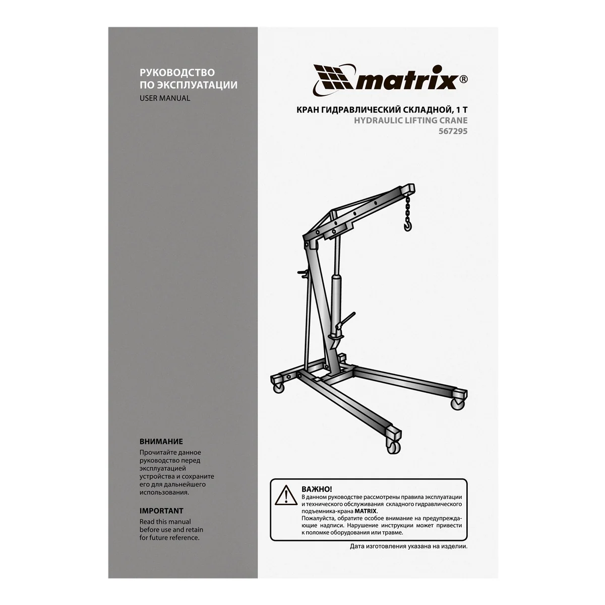 Кран гидравлический, 1 т, H подъема 25-2060 мм, складной (комплект из 2 частей) Matrix 567295