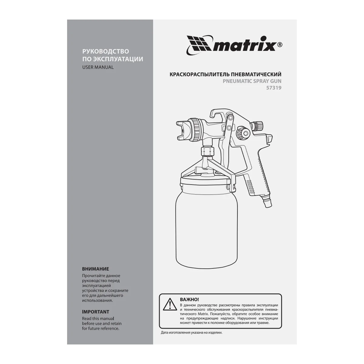 Краскораспылитель HVLP пневмат. с нижним бачком V= 1 л, сопло диаметром 1.4 мм Matrix 57319