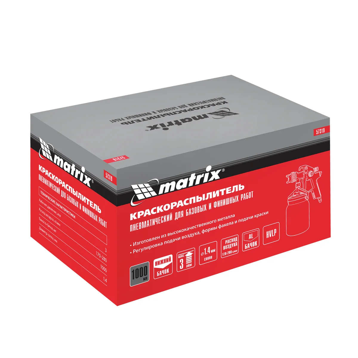 Пневматический краскораспылитель с нижним бачком Matrix 57319 объемом 1 л, с соплом диаметром 1,4 мм, расходует 170-280 л воздуха в минуту и предназначен для выполнения окрасочных работ. Позволяет работать с лакокрасочными материалами разных типов и консистенции. Благодаря технологии HVLP (High Volume Low Pressure, высокий объем, низкое давление) на поверхность переносится до 65% ЛКМ, что обеспечивает высокую производительность и сокращает потери краски. Краскораспылитель пригодится в мастерской, в гараже и в автосервисе.ПреимуществаРешение широкого спектра задач — предусмотрена возможность регулировки давления воздуха, подачи краски, направления и формы факела в зависимости от потребностей пользователя.Прочность и долговечность — корпус пистолета и бачок из алюминиевого сплава устойчивы к механическим повреждениям и коррозии.Обработка участков большой площади — вместительный бачок обеспечивает длительную работу без дозаправки.Комфортное использование — нижнее расположение бачка и небольшой вес пистолета позволяют уменьшить нагрузку на руки.