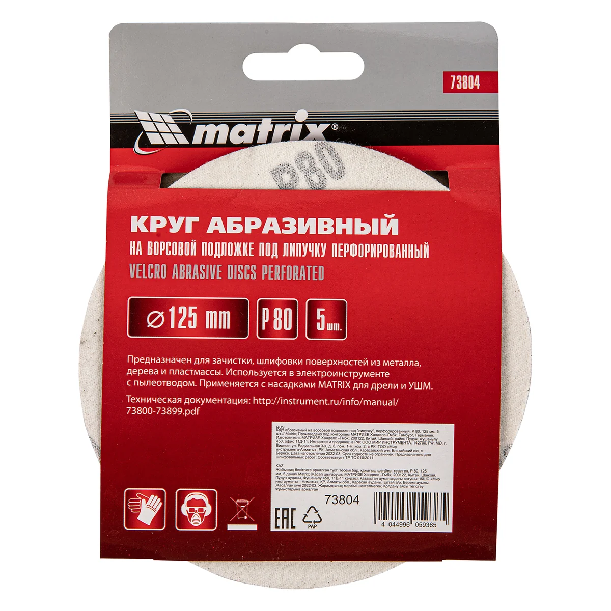 Круг абразивный на ворсовой подложке под "липучку", перфорированный, P 80, 125 мм, 5 шт Matrix 73804