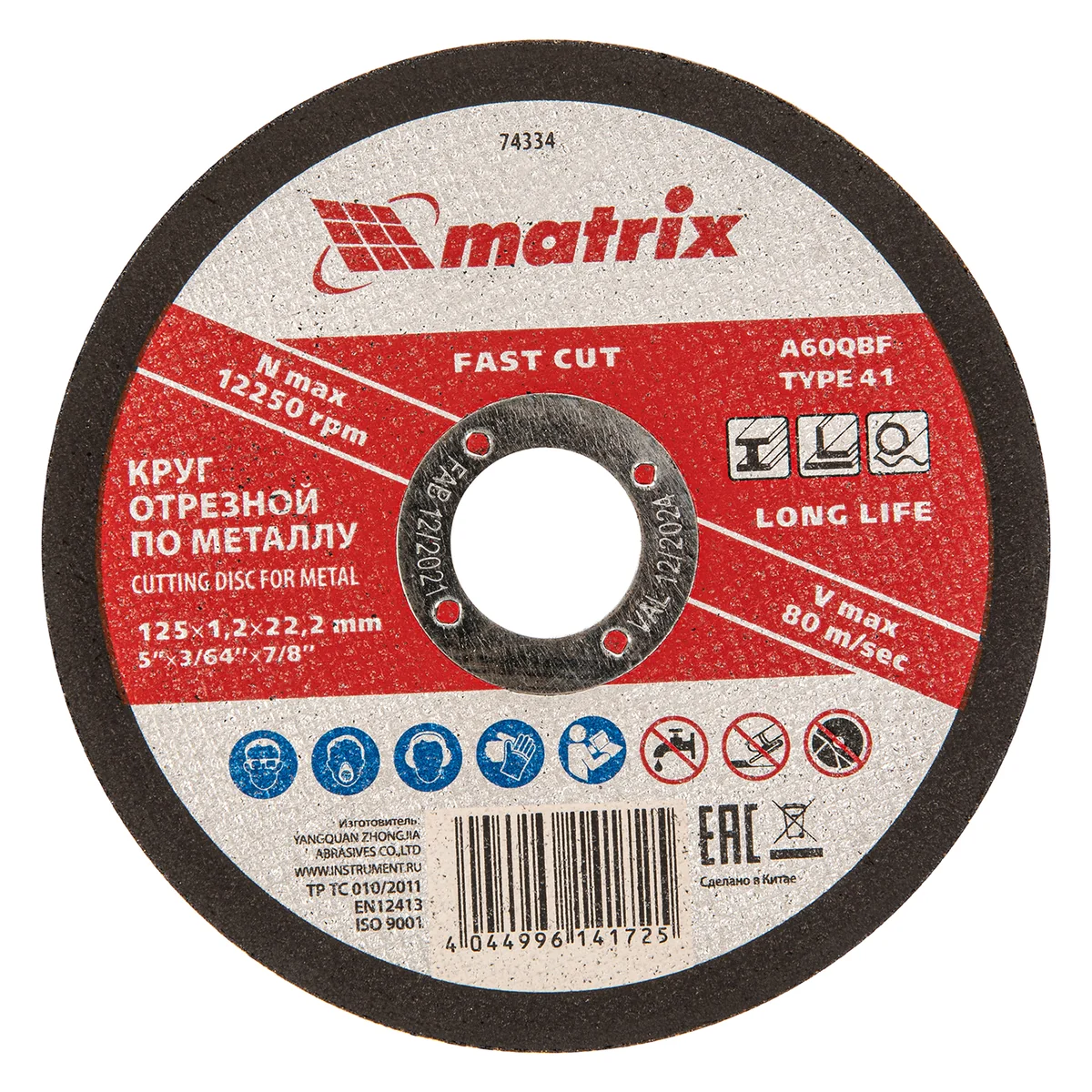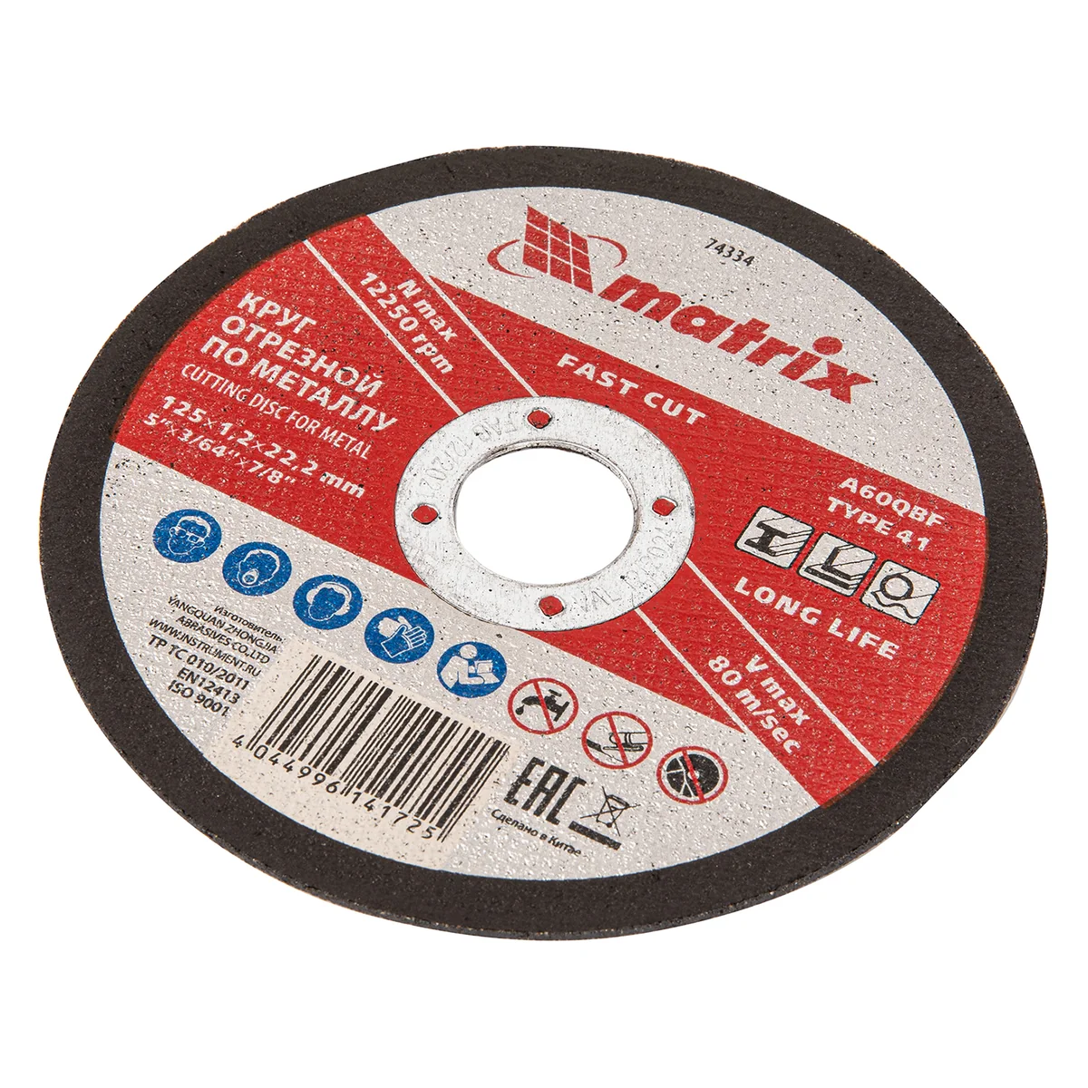 Отрезной круг по металлу Matrix A60QBF 74334, 125 х 1,2 х 22,2 мм, оптимально подходит для сухого реза углеродистых сталей. Он устанавливается на углошлифовальные машины с посадочным диаметром 22,2 мм. Круг рассчитан на бытовое использование в частной мастерской или гараже.ПреимуществаАбразив из оксида алюминия с добавками обеспечивает высокую скорость реза и увеличивает ресурс круга.Бакелитовая связка с упрочняющими элементами устойчива к нагреву, поэтому круг не деформируется при интенсивных нагрузках.За счет средней твердости связки круг можно использовать для реза как мягких, так и твердых углеродистых сталей.Двухслойная стеклосетка отличается прочностью на разрыв, поэтому повышает безопасность работы.Благодаря толщине 1,2 мм круг обладает высокой режущей способностью и позволяет добиться ровного среза.