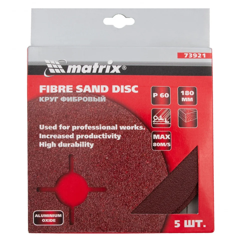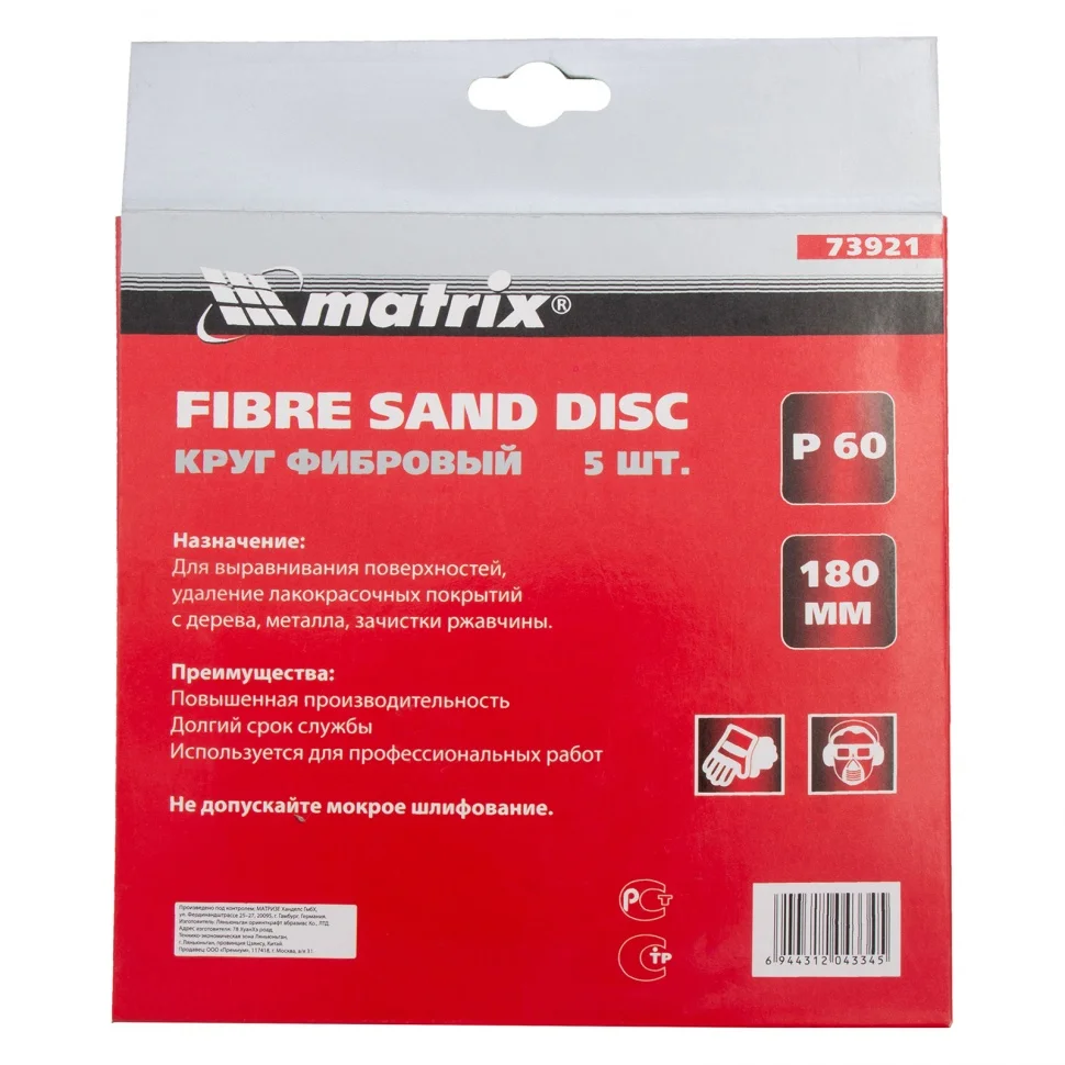 Круги фибровые 5 шт, Р 60, 180 х 22 mm Matrix 73921