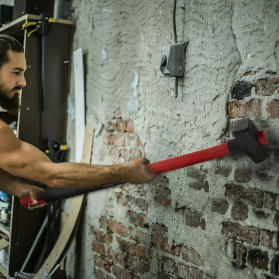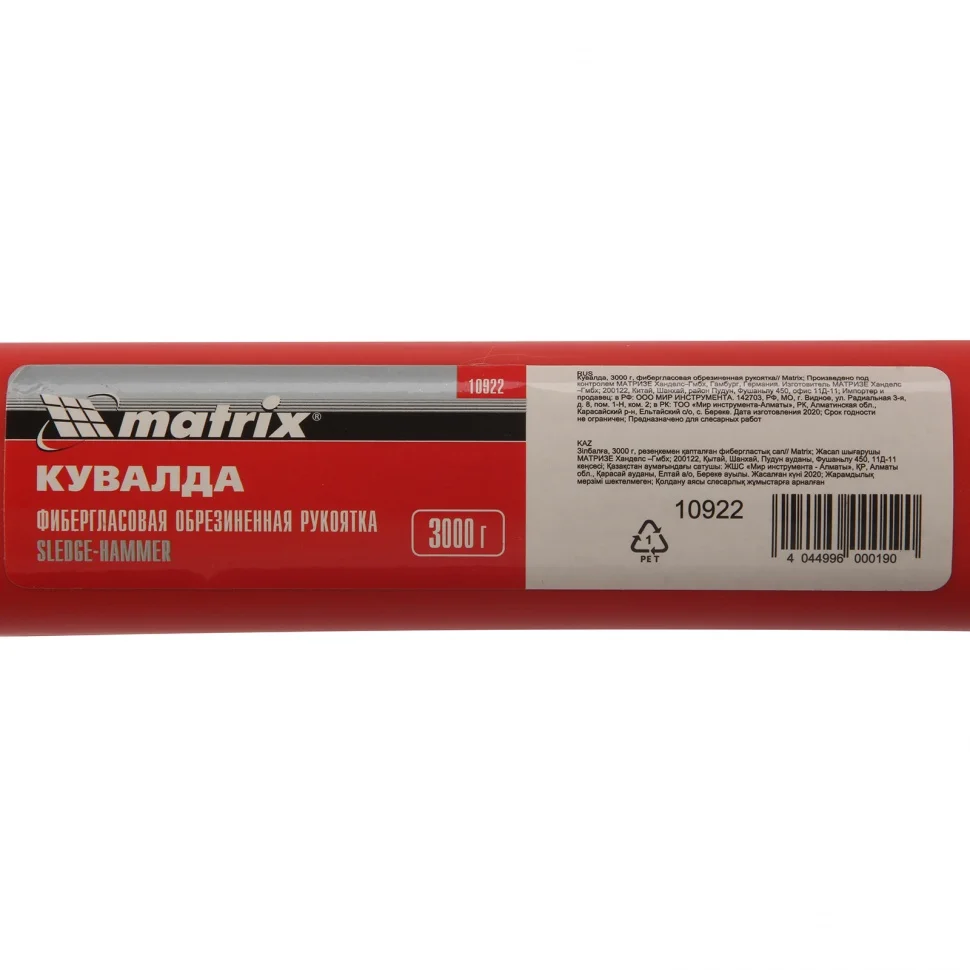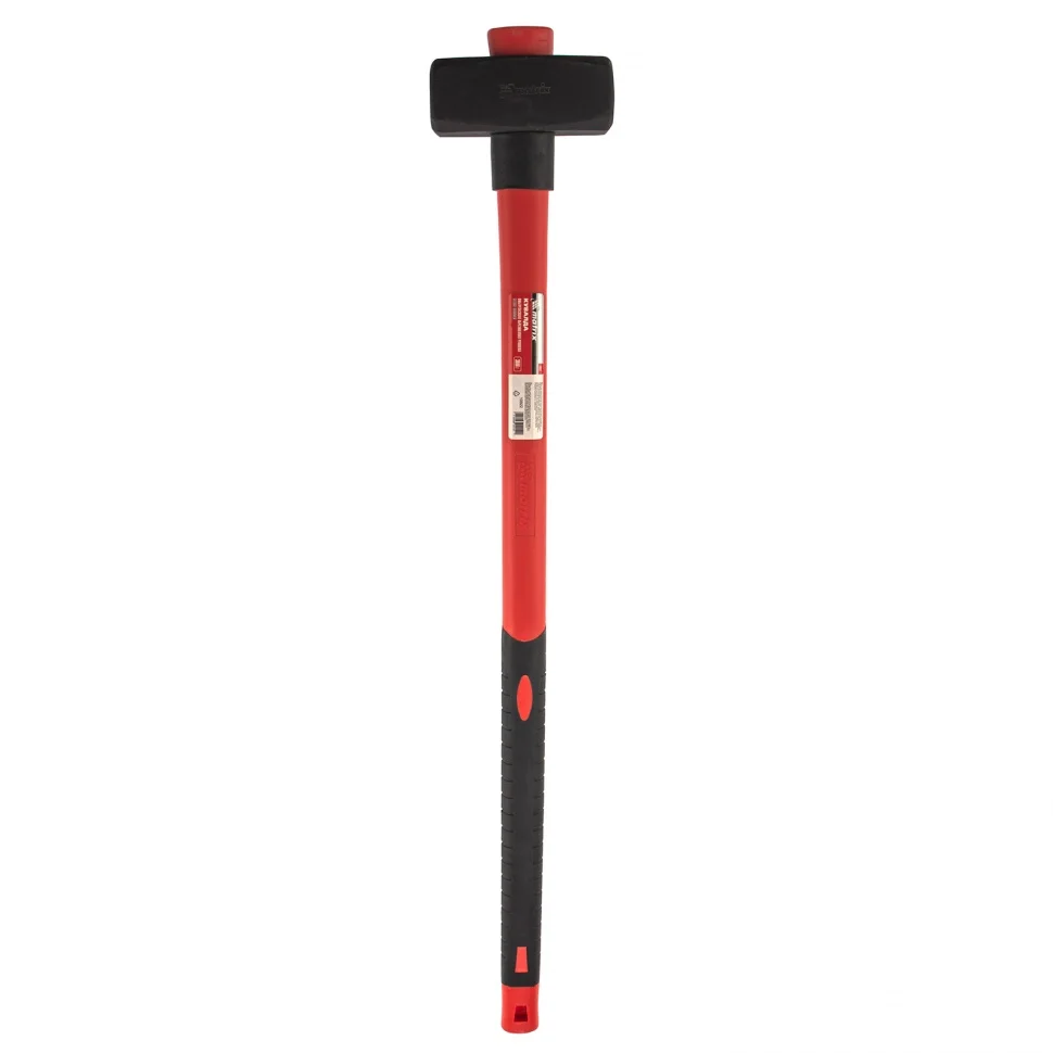 Кувалда Matrix 10922 длиной 900 мм, с бойком весом 3000 г и фибергласовой обрезиненной рукояткой, предназначена для демонтажных работ — разрушения камня, кирпича, бетона. Также может использоваться для правки автомобильных дисков и сборочных работ. Удлиненная рукоятка позволяет наносить удары большой силы, а кованый боек отличается прочностью и не подвержен деформациям. Кувалда рекомендована для профессионального применения. ПреимуществаОптимальное соотношение твердости и прочности — голова кувалды изготовлена из высококачественной среднеуглеродистой стали 45, а ударные поверхности прошли закалку токами высокой частоты до 40-45 HRC, поэтому боек не расколется и не расплющится от ударов.Долгий срок службы — поверхность головы покрыта черным лаком для защиты от коррозии.Надежная фиксация бойка — рукоятка вставлена на протяг и снабжена страховочной резинкой.Безопасная работа — благодаря снятым фаскам от бойка не отколются мелкие частицы во время удара.Надежность и низкая отдача — пластиковая рукоятка имеет толстый фибергласовый стержень.Удобный захват — благодаря резиновому рифленому покрытию рукоятка не выскальзывает из ладони.