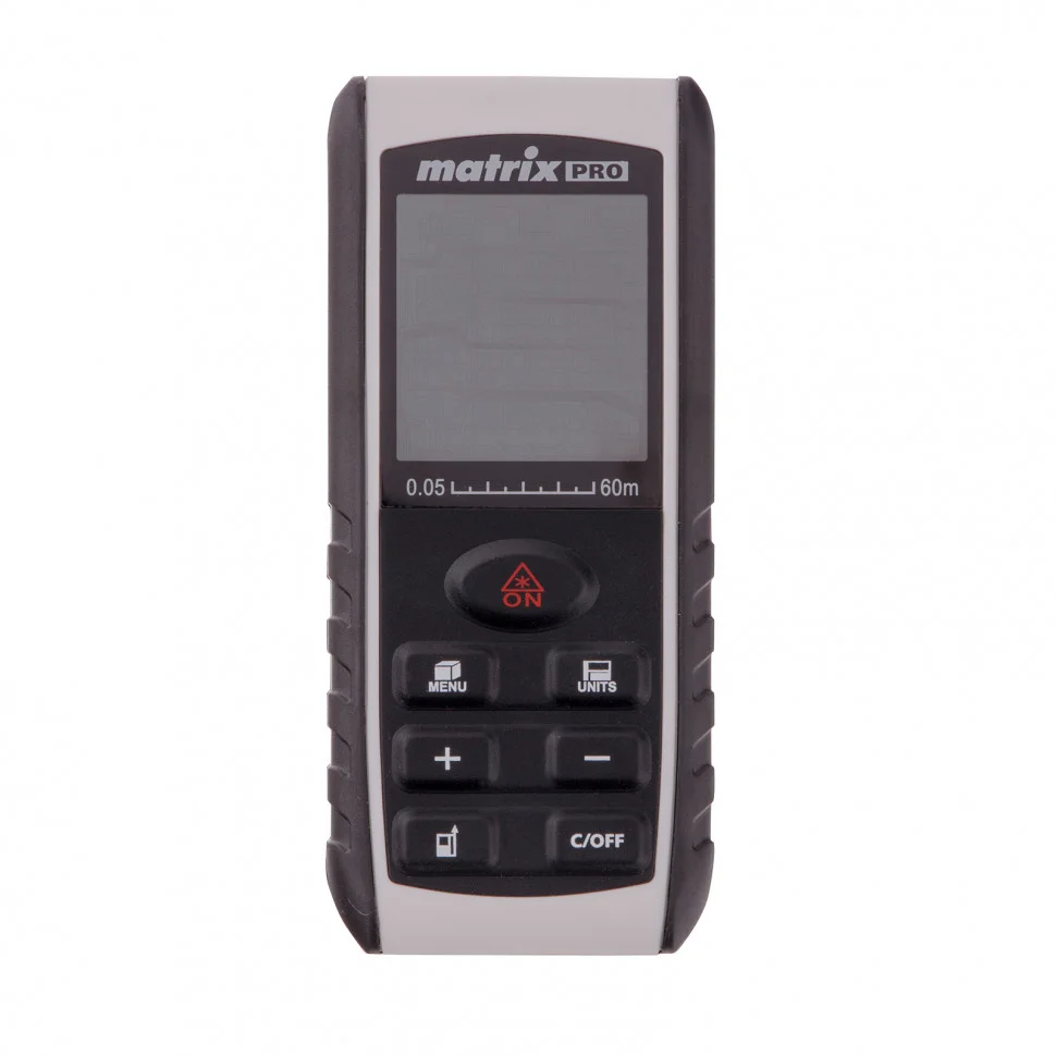 Лазерный дальномер Matrix LD-60 38016 с электронным угломером позволяет измерять длину на расстоянии от 0,05 до 60 м, вычислять площадь и объем помещения, а также измерять углы. Функция складывания и вычитания полученных результатов существенно облегчает и ускоряет работу. Дальномер будет полезен для выполнения работ по укладке плитки, установке натяжных потолков и напольных конструкций, монтаже окон и дверей, проектированию пространства.ПреимуществаНадежность и долговечность — корпус выполнен из ударопрочного ABS-пластика.Вычисления по теореме Пифагора — можно измерить расстояние даже при отсутствии отражающей поверхности или наличии препятствий на пути луча.Режим непрерывного измерения — можно производить замеры в движении для определения различных расстояний до объекта.Фиксация результатов — встроенная память позволяет сохранять и просматривать полученные результаты.Высокий ресурс — дальномер питается от двух батареек ААА, которых хватает на 1000 замеров.Экономия заряда батареи — прибор автоматически отключается через 150 с бездействия.Эргономичность — благодаря резиновым накладкам с рельефной поверхностью прибор не выскальзывает из руки.Удобная транспортировка — к дальномеру прилагается ремешок для подвешивания на запястье.