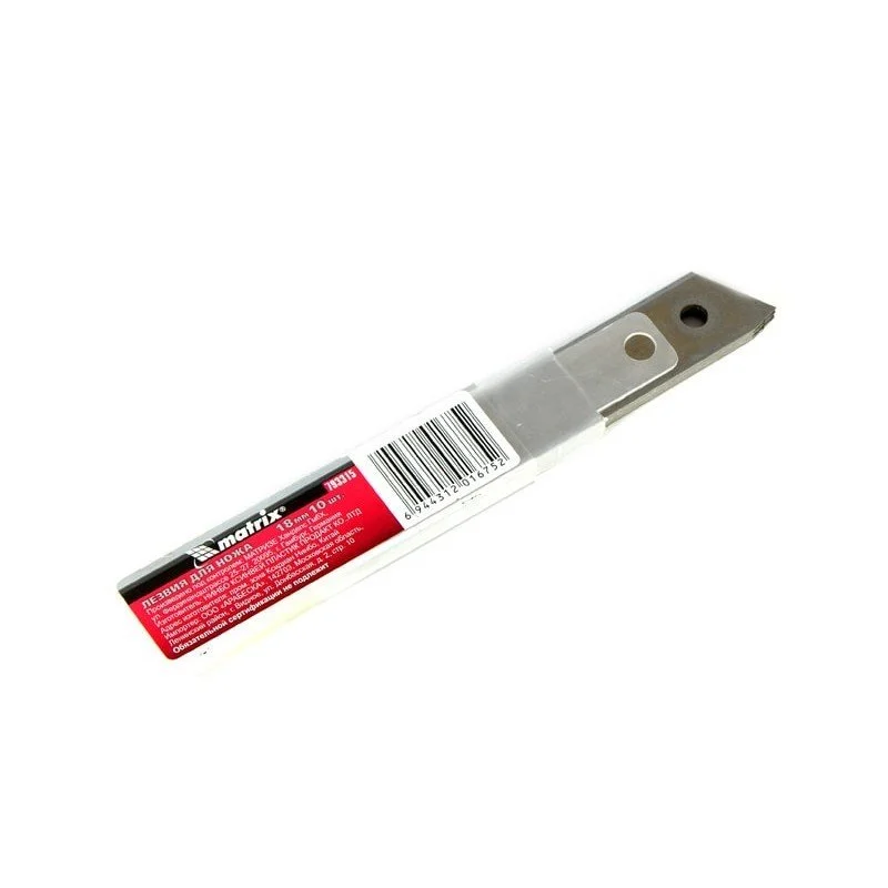 Лезвие MATRIX 793315 - сменное приспособление для ножа. Оно состоит из нескольких сегментов, каждый из которых имеет свою режущую кромку. Если лезвие затупилось, то, обломив один сегмент, можно продолжить работу новой режущей кромкой. Выполнено из стали твердостью 65 HRс. Отлично подходит для резки картона, бумаги и других подобных материалов.