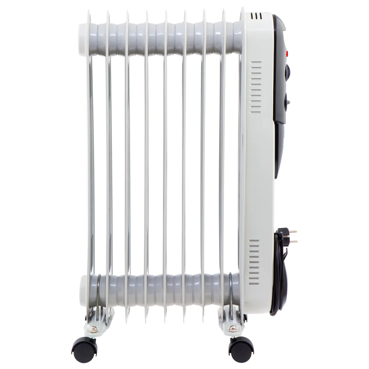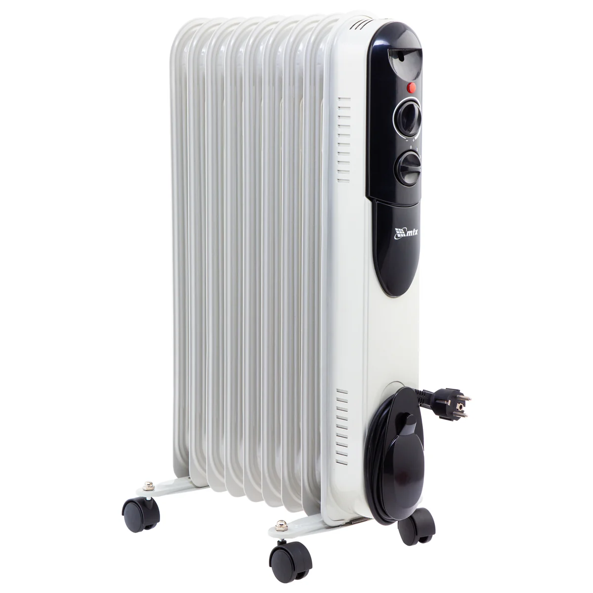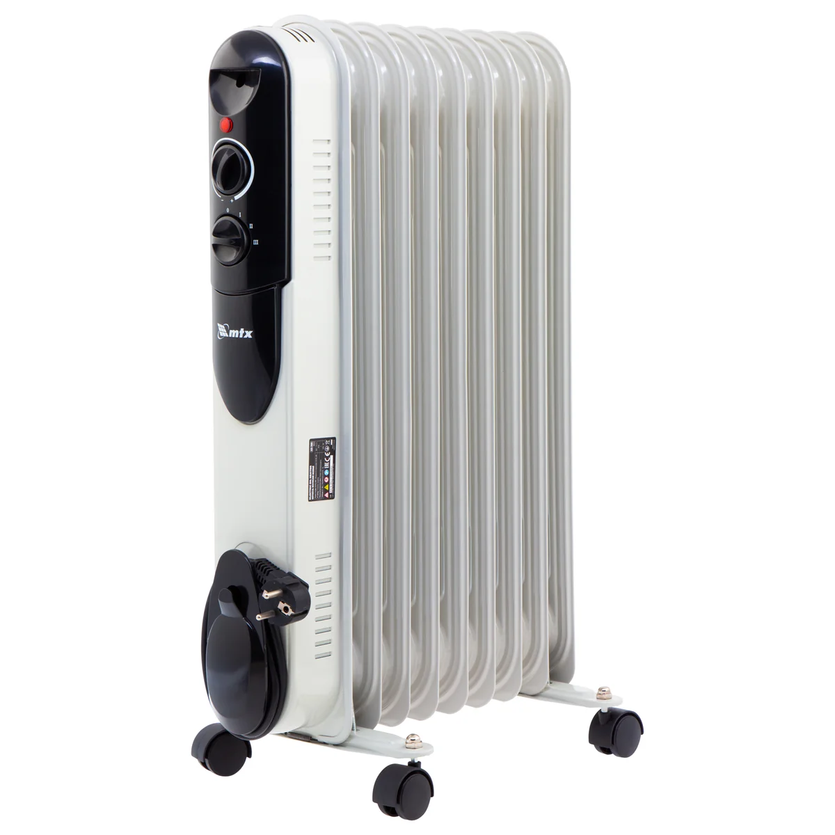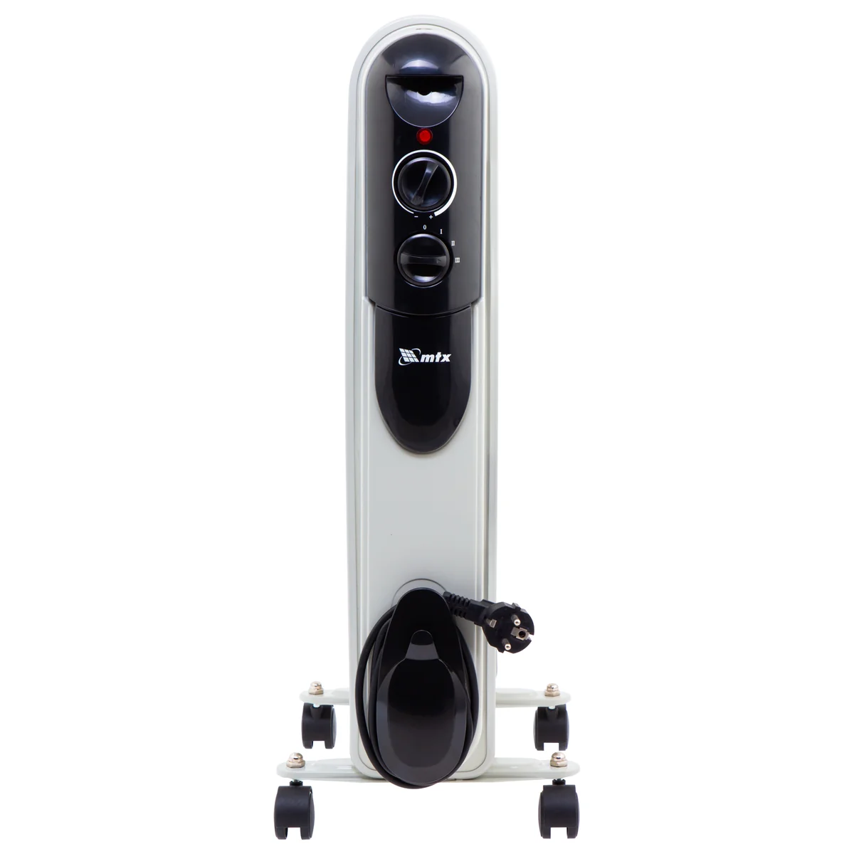 Масляный обогреватель MTX OCH-2000 98303 максимальной мощностью 2000 Вт питается от сети 230 В и предназначен для обогрева кухни, комнаты, офиса или других помещений площадью до 20 кв. м. Нагревательная поверхность с 9 секциями не сушит воздух и не вызывает появление неприятных запахов. Обогреватель работает абсолютно бесшумно, поэтому его использование не вызывает дискомфорт.Преимущества3 режима работы — можно установить мощность нагрева 800, 1200 и 2000 Вт в зависимости от площади помещения.Автоматическое поддержание температуры — механический термостат включает и отключает обогреватель по мере необходимости для достижения заданных параметров работы.Безопасность — система защиты отключает обогреватель при опрокидывании и перегреве.Удобная эксплуатация — о работе обогревателя информирует световой индикатор.Легкое перемещение — обогреватель оснащен 4 колесами, а на корпусе имеется удобная ручка.Продуманное хранение — конструкцией предусмотрен кронштейн для намотки сетевого кабеля и крепления вилки.