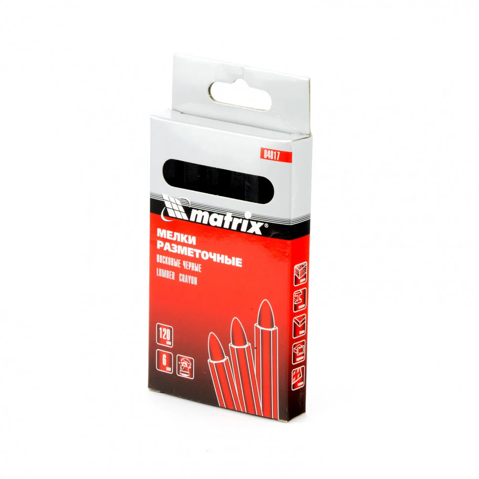 Черные разметочные восковые мелки Matrix 84817 длиной 120 мм, 6 шт. в коробке, пригодятся для нанесения линий и различных обозначений. Они универсальны, поэтому возможно применение на поверхностях с гладкой и шероховатой текстурой: бетоне, металле, пластике, керамике, стекле.ПреимуществаВодонепроницаемые мелки можно использовать на сухих и влажных поверхностях.За счет шестигранной формы мелки удобно лежат в руке и не скатываются с рабочей поверхности.Шести мелков длиной по 120 мм каждый хватит на долгое использование.Картонная коробка с европодвесом обеспечивает удобное хранение мелков.
