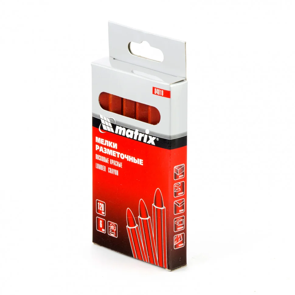 Красные разметочные восковые мелки Matrix 84818 длиной 120 мм, 6 шт. в коробке, пригодятся для нанесения линий и различных обозначений. Они универсальны, поэтому возможно применение на поверхностях с гладкой и шероховатой текстурой: бетоне, металле, пластике, керамике, стекле.ПреимуществаВодонепроницаемые мелки можно использовать на сухих и влажных поверхностях.За счет шестигранной формы мелки удобно лежат в руке и не скатываются с рабочей поверхности.Шести мелков длиной по 120 мм каждый хватит на долгое использование.Картонная коробка с европодвесом обеспечивает удобное хранение мелков.