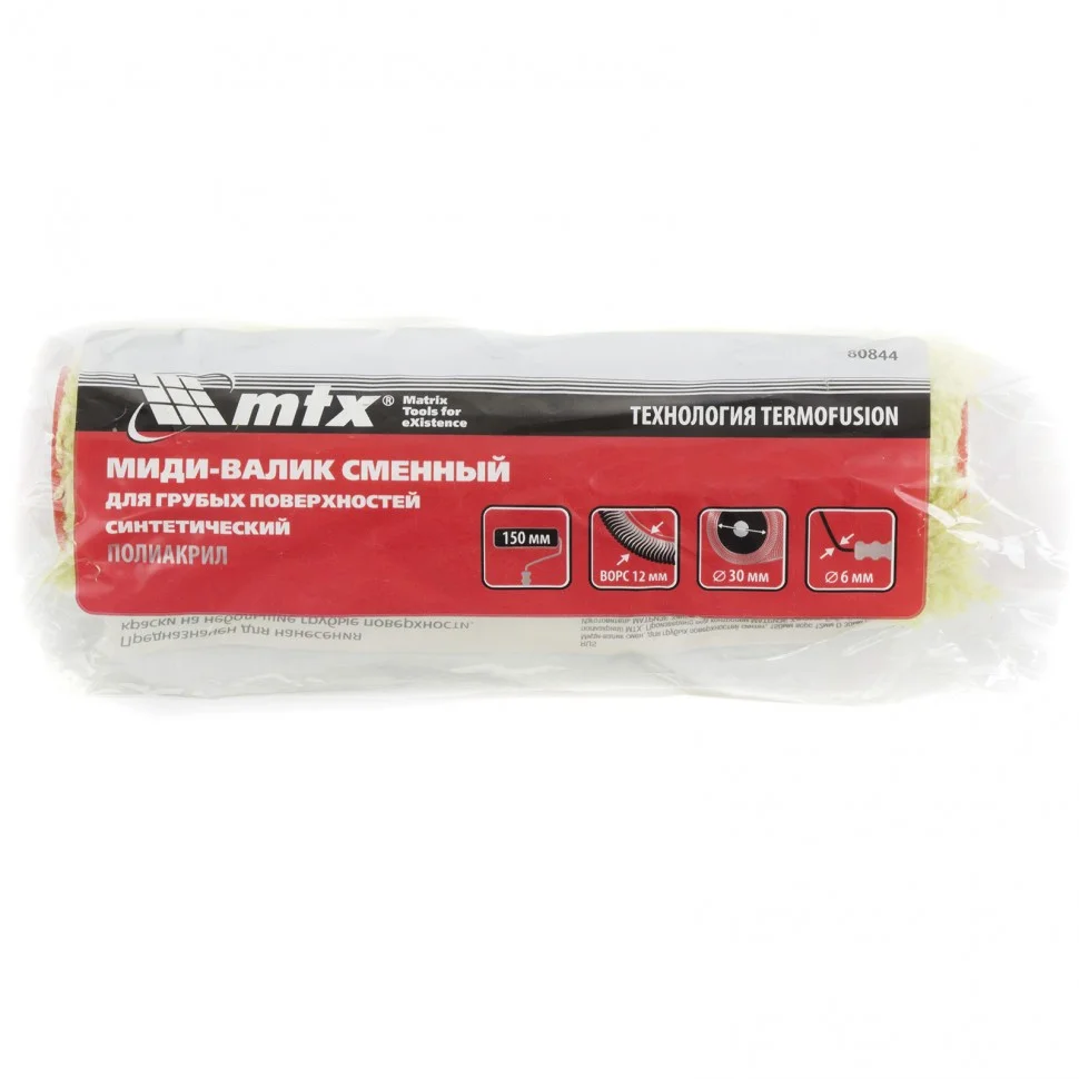 Сменный синтетический миди-валик для грубых поверхностей MTX 80844 с ворсом из полиакрила 12 мм, шириной 150 мм, диаметром ролика 30 мм подходит для бюгелей диаметром 6 мм. Шубка с ворсом из полиакрила качественно прокрашивает неровные поверхности. Валиком удобно работать на небольших участках и в труднодоступных местах.ПреимуществаВалик из полиакрила используется для нанесения красок на водной основе или красок с ограниченным содержанием растворителей.Хорошая формостойкость валика обеспечивает полное прокрашивание поверхности.Рабочая часть валика сделана из полиакрила на тканой основе, волокна которого не выпадают и не спутываются, восстанавливают свою форму после прокатки, а также хорошо распределяют лакокрасочный материал без разбрызгивания и образования подтеков.Крепление шубки к ролику по технологии Termofusion - она не отклеивается при интенсивном использовании.