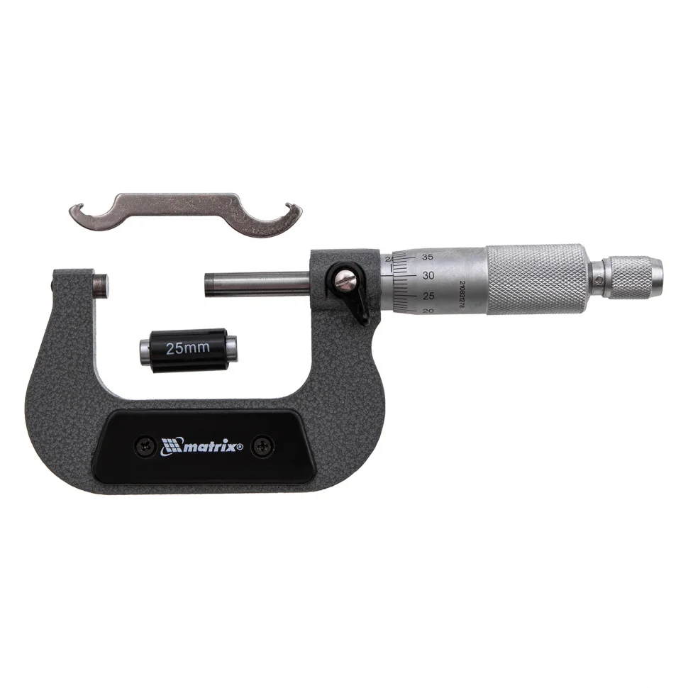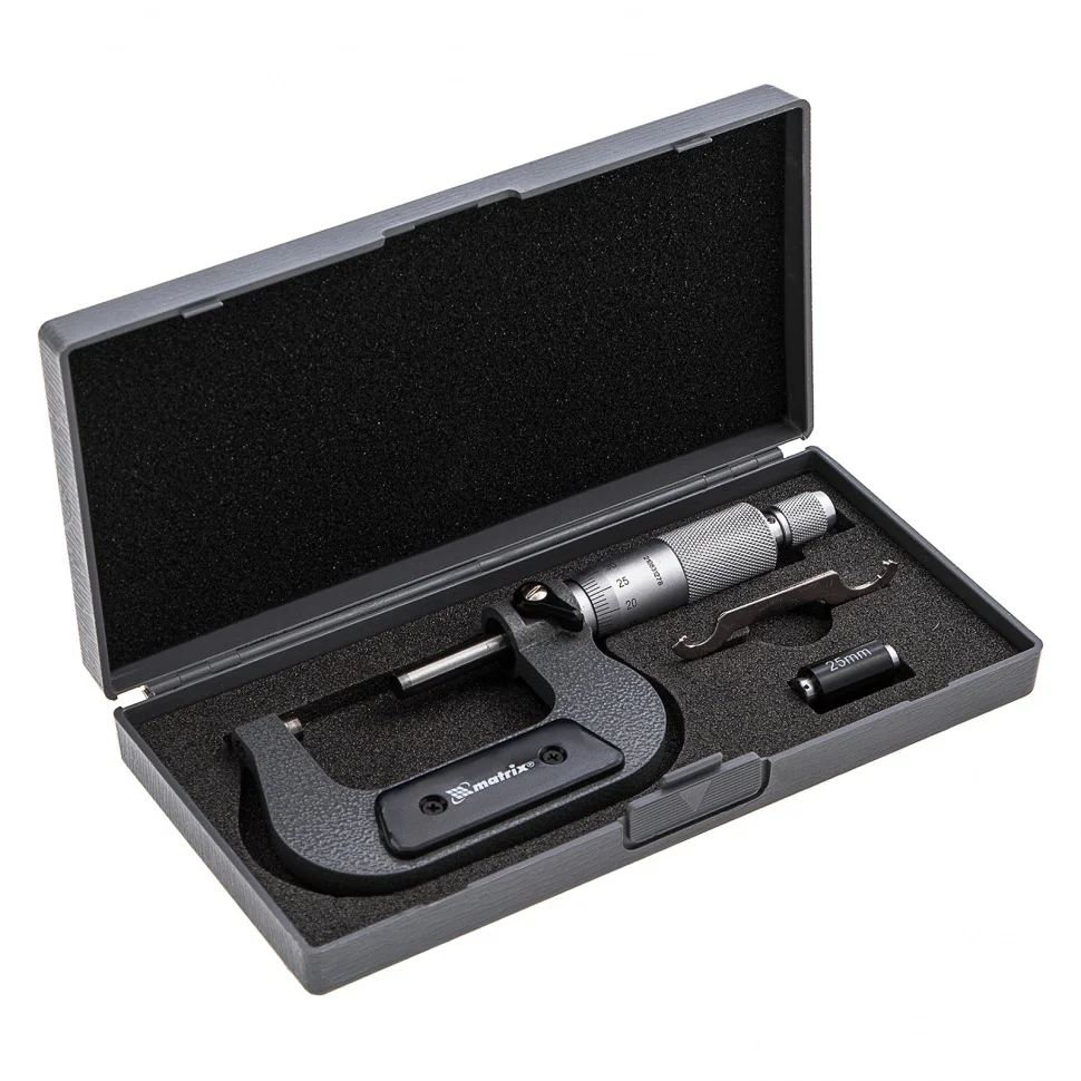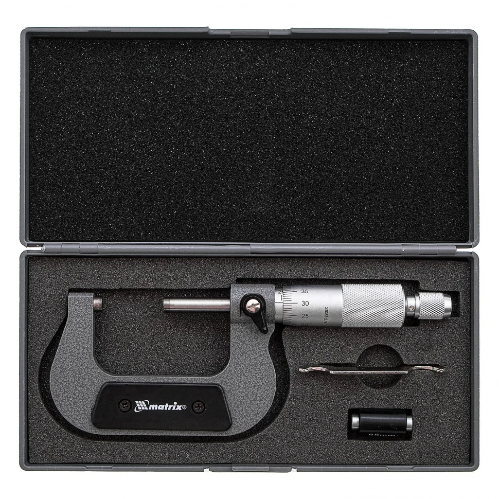 Механический микрометр Matrix 317505 используется для измерения толщины листового металла и деталей размером 25-50 мм. Обеспечивает высокую точность результатов — шаг измерения составляет 0,01 мм с допустимой погрешностью ±0,004 мм. Комплектуется установочной мерой, позволяющей при необходимости произвести настройку прибора. Микрометр будет полезен на производстве, в слесарной мастерской и автосервисе..ПреимуществаМикрометр изготовлен из инструментальной стали, поэтому отличается прочностью и долговечностью.Конструкцией предусмотрен стопор, фиксирующий микровинт для последующего снятия показаний.Прибор поставляется в пластмассовом кейсе с поролоновой прокладкой, в котором его можно хранить и перевозить без риска повреждения.