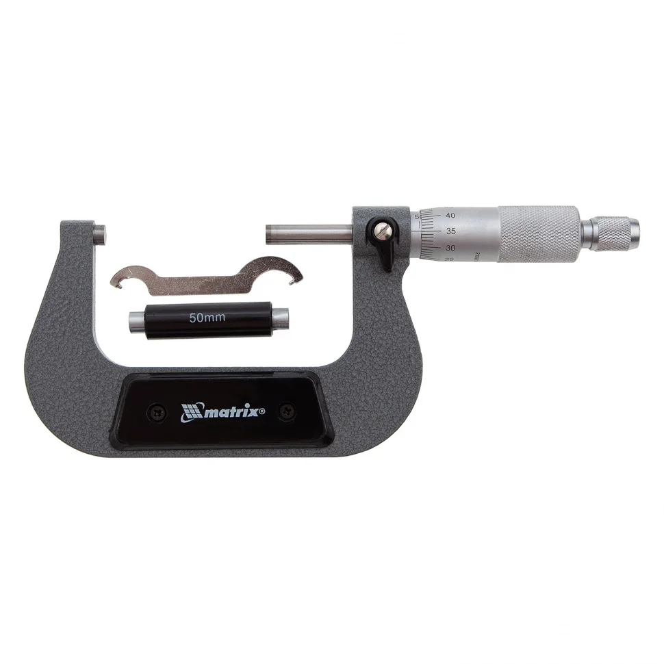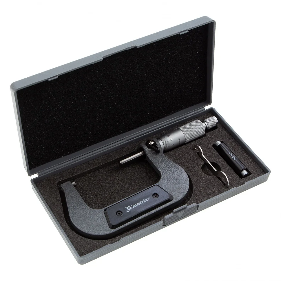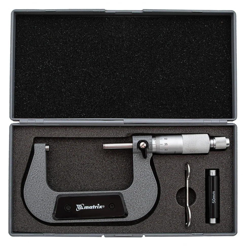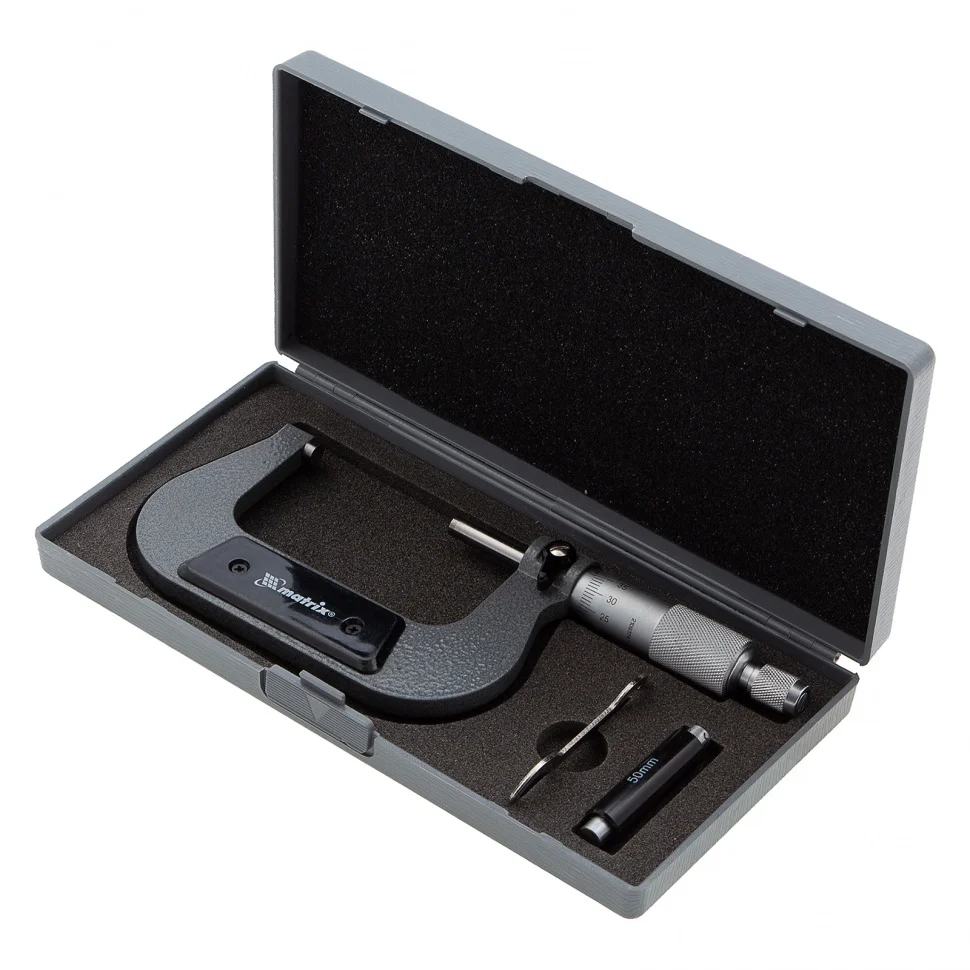 Механический микрометр Matrix 317755 используется для измерения толщины листового металла и деталей размером 50-75 мм. Обеспечивает высокую точность результатов — шаг измерения составляет 0,01 мм с допустимой погрешностью ±0,004 мм. Комплектуется установочной мерой, позволяющей при необходимости произвести настройку прибора. Микрометр будет полезен на производстве, в слесарной мастерской и автосервисе.ПреимуществаМикрометр изготовлен из инструментальной стали, поэтому отличается прочностью и долговечностью.Конструкцией предусмотрен стопор, фиксирующий микровинт для последующего снятия показаний.Прибор поставляется в пластмассовом кейсе с поролоновой прокладкой, в котором его можно хранить и перевозить без риска повреждения.