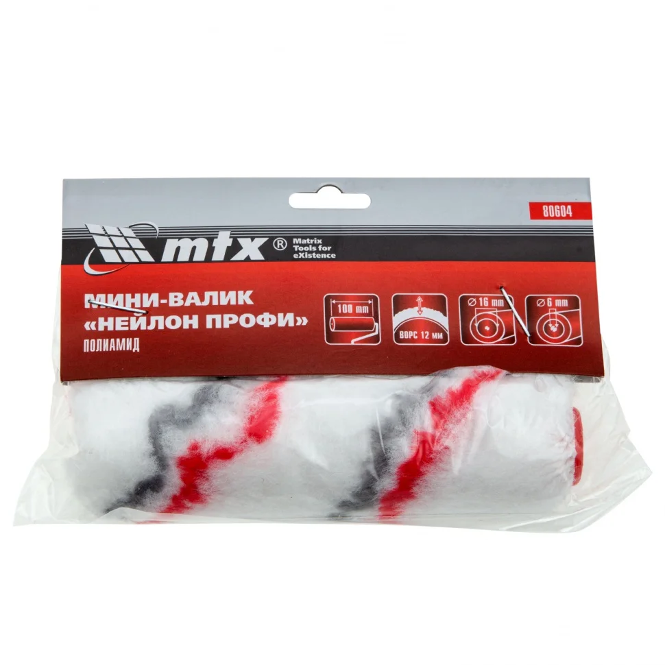 Мини-валик сменный MTX «НЕЙЛОН Профи» 80604 из полиамида с ворсом 12 мм, шириной 100 мм и диаметром ролика 16 мм подходит для бюгелей диаметром 6 мм. Он предназначен для окрашивания небольших участков и труднодоступных мест. Валик может использоваться как с водно-дисперсионными, так и органорастворимыми красками. Шубка из полиамида обладает максимальной износостойкостью.ПреимуществаДлина ворса 12 мм - валик хорошо прокрашивает неровности, а значит, подходит не только для гладких, но и для шероховатых поверхностей.Стойкость к изнашиванию и разрывным нагрузкам - шубка хорошо держит форму, выдерживает длительное применение.Высокий показатель впитываемости и отдачи краски - валик облегчает работу и повышает результат окраса.Валик не ворсит на окрашиваемую поверхность - качество покрытия остается высоким.Гарантированная защита от деформации и отслаивания - шубка приклеена термическим способом, это позволяет использовать валик многократно.Бесшовная шубка позволяет получить равномерно окрашенную поверхность без полос.