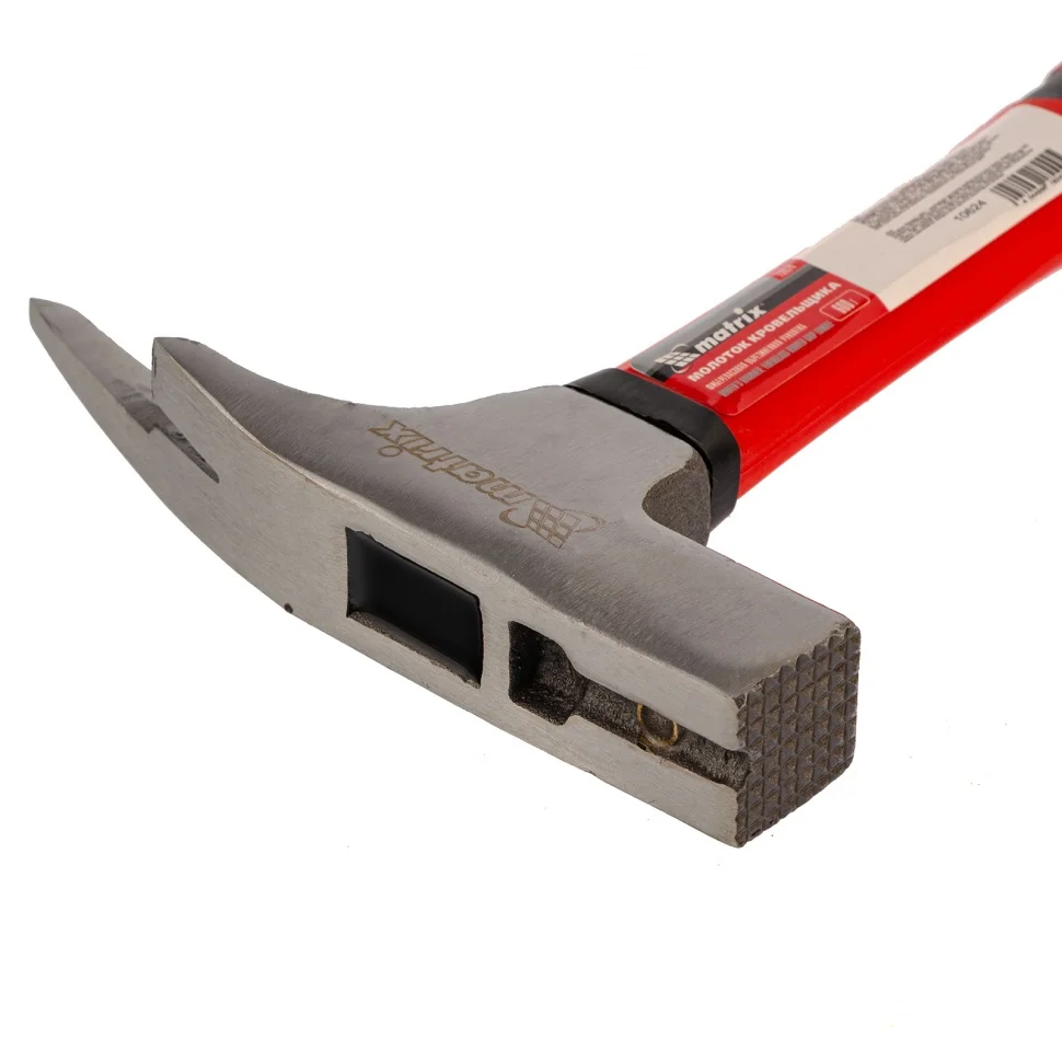 Молоток кровельщика Matrix 10624 с головкой весом 600 г и фибергласовой обрезиненной рукояткой предназначен для выполнения кровельных работ. Способен забивать и придавать ровную форму крупным гвоздям, а также пробивать отверстия и отгибать кромки кровельного материала. Безопасность обеспечивается благодаря насечкам на рабочей поверхности бойка, которые не позволяют ему соскользнуть с гвоздя.Преимущества Головка изготовлена из конструкционной стали 45, обладает оптимальными показателями прочности и долговечности. Боек закален до твердости 45-50 HRC, поэтому устойчив к повреждениям и износу даже при интенсивных нагрузках. Магнитный фиксатор в верхней части головки позволяет действовать одной рукой, что необходимо при работе в труднодоступных местах. Головка покрыта бесцветным лаком, защищающим ее от образования коррозии. Фибергласовый стержень придает рукоятке жесткость и устойчивость к механическим воздействиям. Рукоятка эффективно гасит вибрации при ударе, снижая нагрузку на руку мастера. Благодаря обрезиненной поверхности рукоятка не скользит в ладони, а вентиляционные отверстия на рукоятке повышают комфортность работ. Отверстие на конце рукоятки позволяет подвешивать молоток-гвоздодер, что облегчает его хранение.
