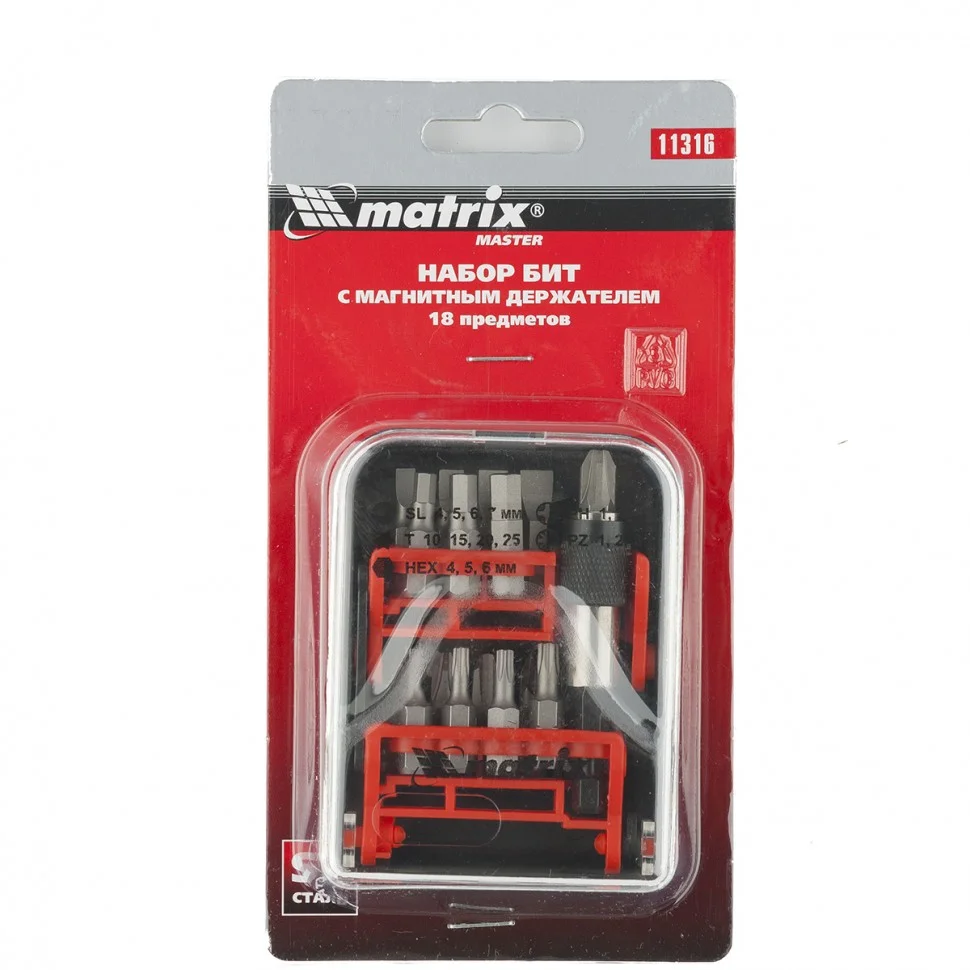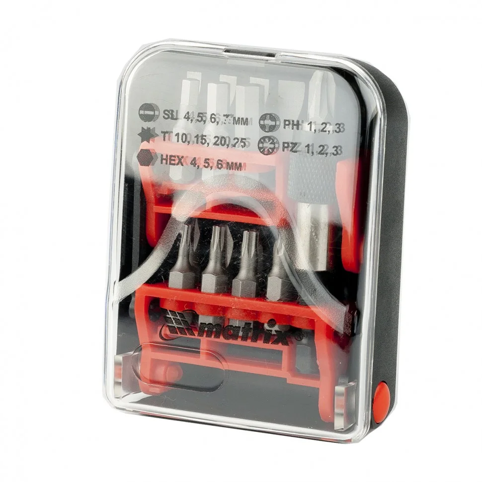 Набор бит Matrix арт. 11316 подходит для шуруповертов, отверток для сменных бит и реверсивных отверток, и применяется при проведении монтажных/демонтажных работ с резьбовыми соединениями. Магнитный адаптер удлиняет насадки для комфортной работы в труднодоступных местах и обеспечивает быструю замену бит.ПреимуществаВ набор включены биты: PH и PZ 1-3 мм, SL 4-7 мм, TORX 10 мм, 15 мм, 20 мм, 25 мм и HEX 4-6 мм.Высокая прочность и износостойкость бит достигается за счет материала изготовления — инструментальной легированной стали S2.Оцинковано-фосфатированное защитное покрытие предотвращает появление коррозии.Благодаря быстрозажимному механизму биты надежно удерживаются в адаптере, это позволяет освободить вторую руку для придерживания закрепляемого материала.Пластиковый кейс — биты удобно хранить и брать с собой на выездные работы.За счет зажима кейс можно закрепить на ремне и использовать при выполнении работ на высоте.