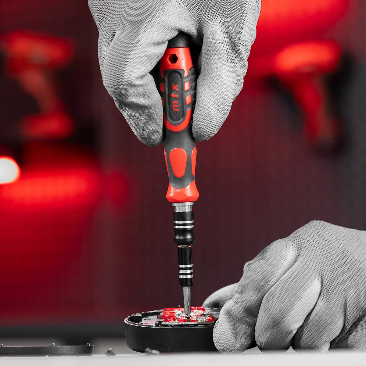 Набор для точных работ MTX 135697 включает в себя 93 биты, 9 торцевых головок, телескопический и гибкий удлинители, намагничиватель-размагничиватель бит, отвертку и пинцет с защитным колпачком. С его помощью можно отремонтировать очки, игрушки, портативную и бытовую технику и т.д. Выдвижной стержень, гибкий удлинитель и пинцет позволяют работать с мелкими деталями в углублениях и труднодоступных местах.