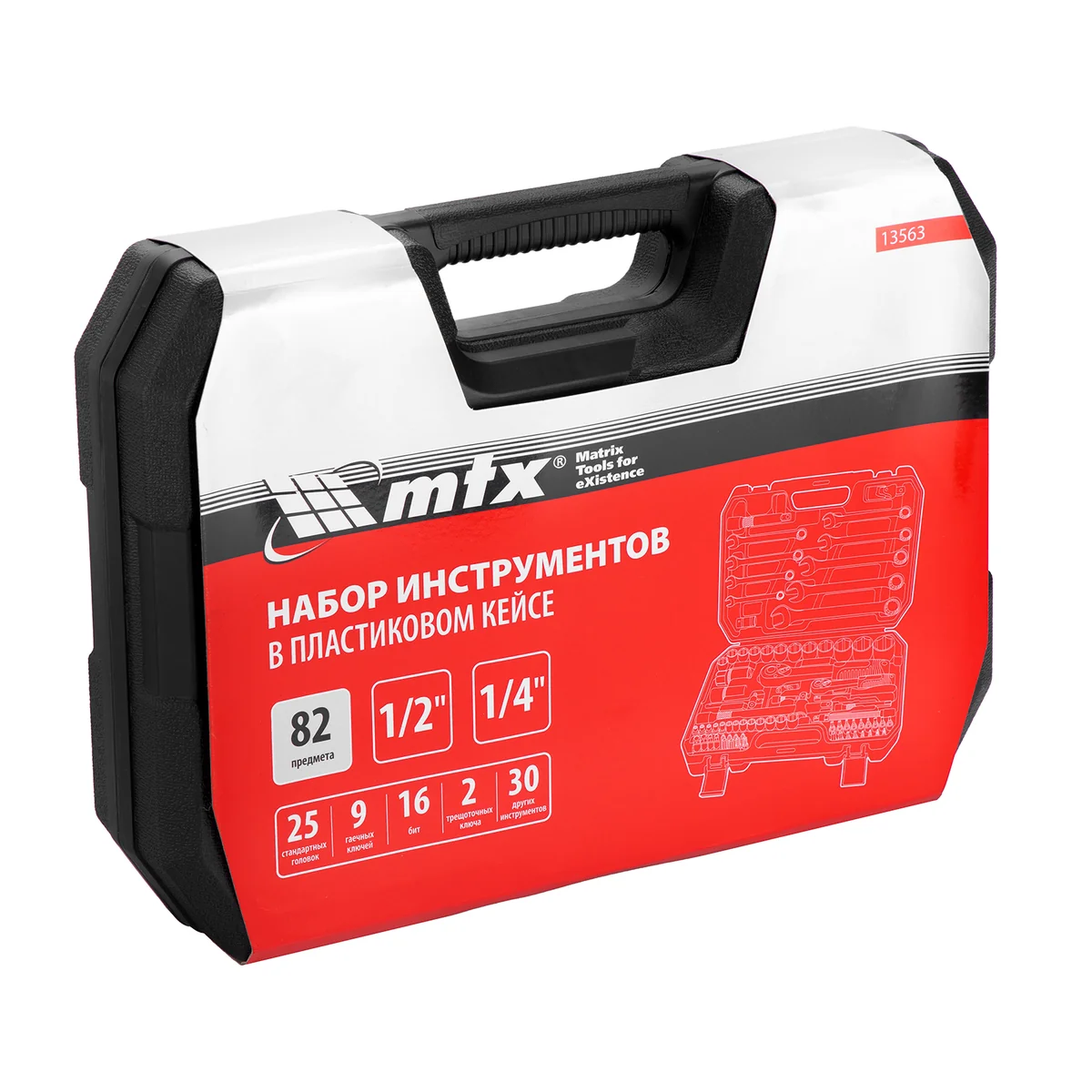 Набор инструментов MTX 13563 упакован в пластиковый кейс и состоит из 82 предметов с присоединительным размером 1/2" и 1/4", предназначенных для слесарных работ, преимущественно монтажа и демонтажа резьбового крепежа с разными типами шлицев. В комплект поставки входят карданы, удлинители и переходники, облегчающие работу в труднодоступных местах. Набор используется для ремонта автомобилей, а также полезен в быту.