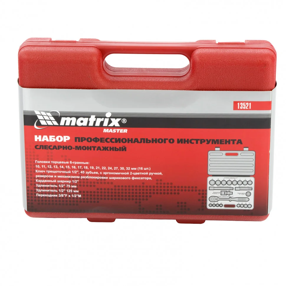 Набор слесарно-монтажный Matrix 13521 с квадратом 1/2 дюйма состоит из 21 предмета и используется для монтажа и демонтажа резьбовых элементов - гаек, болтов и др. Он незаменим в мастерской или гараже, пригодится в быту. В набор входят торцевые головки размером от 10 до 32 мм, что обеспечивает широкий диапазон его применения.ПреимуществаЭлементы набора изготовлены из твердой и прочной хромованадиевой стали, а значит, прослужат долго.Трещоточный ключ оснащен механизмом реверса, позволяющего не только закручивать, но и откручивать крепеж.Кнопка сброса на трещотке облегчает замену головок.Благодаря эргономичной форме ключ удобно лежит в руке, что снижает усталость во время работы.Удлинители 75 и 125 мм, а также карданный шарнир облегчают работу в труднодоступных местах.Набор помещен в противоударный пластиковый кейс с ложементом, удобный для хранения и транспортировки.