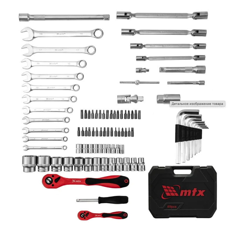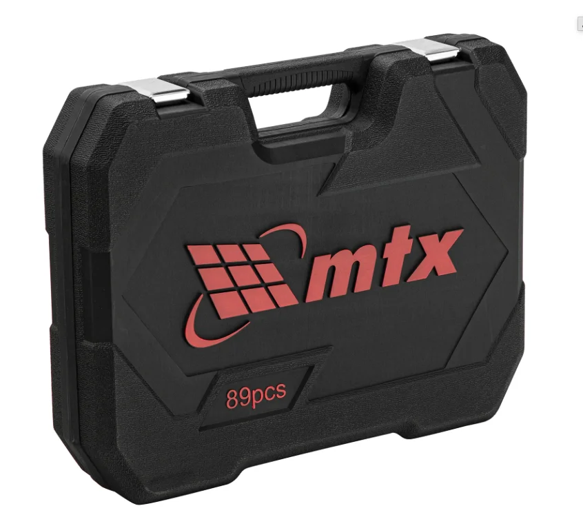 Набор инструментов MTX 135289 состоит из 89 предметов с присоединительными квадратами 1/2″ и 1/4″. Инструменты предназначены для монтажа и демонтажа резьбового крепежа с разными типами шлицев. В комплект поставки входит кардан, удлинители и шарнирные ключи, облегчающие работу в труднодоступных местах. Набор используется для ремонта автомобилей, пригодится также в быту.