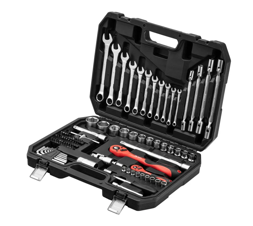 - Удобная эксплуатация — храповики трещоточных ключей с 72 зубьями обеспечивают плавное вращение, торцевые головки с насечками и трещотки с прорезиненными рукоятками не проскальзывают в руках.