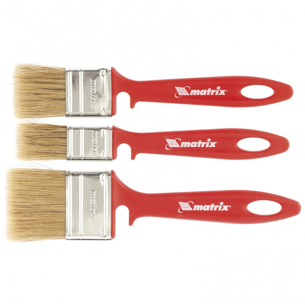 Набор Matrix Color Line «ЭМАЛИ» 83355 включает кисти шириной 25, 35 и 50 мм и предназначен для работы с эмалями, в том числе на акриловой, алкидной основе и на основе растворителя. Натуральная щетина устойчива к износу и воздействию агрессивных жидкостей, а благодаря расщепленным концам хорошо впитывает и отдает краску. Высокая плотность щетины позволяет получить качественное покрытие.ПреимуществаНатуральная светлая щетина двойной выварки обеспечивает отличный забор и удержание краски, а также равномерно распределяет ее по поверхности.Щетина надежно закреплена с помощью тщательно подобранной эпоксидной смолы, клиньев и бандажа.Пластиковые клинья не деформируются при мытье или замачивании, что обеспечивает долговечность инструментов.На бандажи нанесено специальное покрытие для защиты от ржавчины.Форма рукояток продумана таким образом, чтобы мастер не уставал даже при длительной работе.На рукоятке каждой кисти имеется вырез, позволяющий зафиксировать инструмент на малярном ведре или банке.Для удобного хранения на ручках предусмотрены отверстия, за которые кисти можно подвесить.