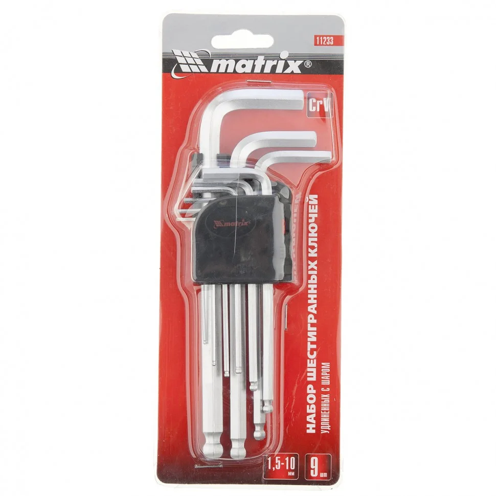 Набор имбусовых ключей Matrix 11233 из стали CrV, 1,5-10 мм, 9 шт., короткие, оксидированные, используются для монтажа и демонтажа крепежа со шлицем HEX. Шестигранники наиболее часто применяются для закручивания мебельных евровинтов и ремонта велосипедов. Г-образная форма ключей позволяет использовать их длинный конец в качестве рабочей части для удобства работы в труднодоступных местах.ПреимуществаКлючи изготовлены из прочной и износостойкой хромованадиевой стали, поэтому прослужат долгое время.Оксидированное покрытие обеспечивает высокую степень защиты от коррозии.Короткие концы ключей могут быть использованы в качестве рабочих для удобства работы в ограниченном пространстве и в случаях, когда требуется приложить большое усилие.Шар на конце каждого ключа позволяет эффективно работать с крепежом под углом.Пластиковый футляр с отверстием для подвеса позволяет компактно и удобно хранить ключи.
