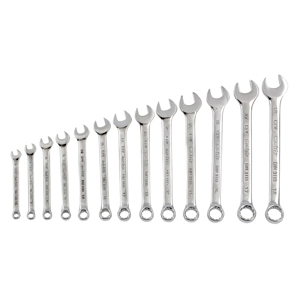 Набор Matrix 15425 включает 25 комбинированных ключей из стали CrV, размером 6-32 мм, с покрытием «полированный хром», которые пригодятся во время ремонтных работ дома или в гараже. С их помощью можно быстро монтировать и демонтировать крепежные элементы. В набор входят инструменты основных типоразмеров, позволяющие эффективно решать поставленные задачи.ПреимуществаВысокая деформационная стойкость — ключи изготовлены из хромованадиевой стали, а рабочие части закалены до твердости 48 HRC.Защита от разрушения — полированное хромоникелевое покрытие предотвращает образование коррозии.Аккуратная работа — накидные части с 12-гранным профилем охватывают всю поверхность крепежа, уменьшая риск деформации его граней.Комфортная работа в ограниченном пространстве — угол наклона кольцевых зевов относительно плоскости инструментов составляет 15 градусов, что делает монтаж крепежа более удобным.Удобный тканевый чехол — ключи, размещенные в индивидуальных кармашках, не потеряются во время хранения и транспортировки.