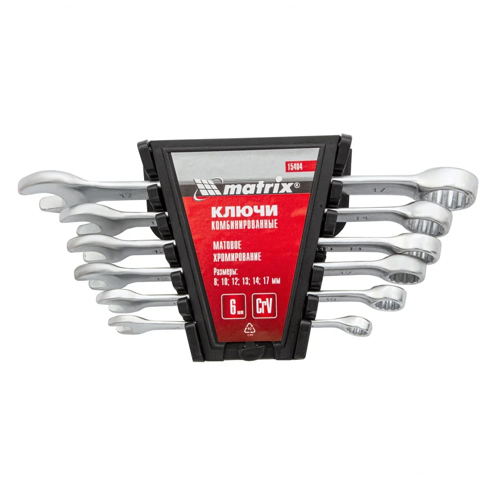 Набор ключей комбинированных Matrix 15404 с покрытием «матовый хром» включает 6 шт. из стали CrV размером 8-17 мм, которые пригодятся при проведении ремонтных работ дома или в гараже. С их помощью можно осуществлять быстрый монтаж и демонтаж крепежных элементов. Кольцевой зев обеспечивает удобство работы благодаря углу наклона 15 градусов относительно плоскости инструмента.ПреимуществаКлючи из хромованадиевой стали обладают необходимыми прочностными характеристиками и высокой сопротивляемостью деформации.Рабочие части инструментов прошли закалку до твердости 45 HRC в соответствии с требованиями ГОСТа.Матовое хромоникелевое покрытие защищает ключи от образования коррозии.Накидные части с 12-гранным профилем позволяют охватить крепеж по всей поверхности, за счет чего снижается риск деформации его граней.Ключи удобно хранить и они не потеряются во время транспортировки, т.к. упакованы в пластиковый держатель.Набор позволяет решить большинство задач по монтажу, т.к. состоит из 6 ключей основных типоразмеров.