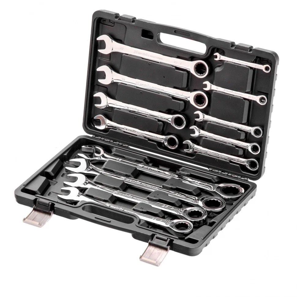 Набор комбинированных трещоточных ключей Matrix 14797, 13 шт., пригодится мастерам и автолюбителям для монтажа/демонтажа болтов и гаек. Храповый механизм с 72 зубьями облегчает закручивание или откручивание крепежей и обеспечивает возможность работы в труднодоступных местах. В наборе представлены 13 ключей основных типоразмеров для работы с различными болтами и гайками.ПреимуществаКлючи выполнены из стали CrV высокого качества, это придает им повышенную прочность и твердость.Хромоникелевое антикоррозионное покрытие надежно защищает инструменты от ржавчины.12-гранный профиль накидной части ключа позволяет охватить всю поверхность крепежа, что исключает деформацию его граней.Надежность храпового механизма обеспечивает его высокая твердость 58 HRC.Специальный пластиковый держатель обеспечивает безопасное хранение и удобную транспортировку.