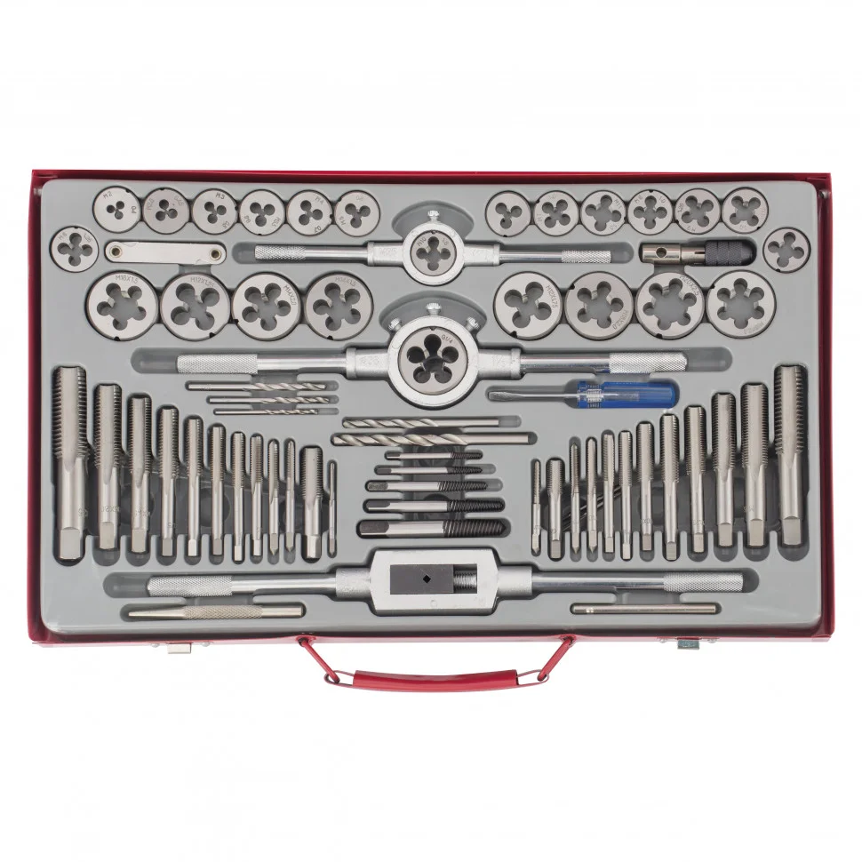 Набор метчиков и плашек Matrix 773065, М2-М20, включает 65 предметов, помещенных в металлический кейс. Входящие в комплект инструменты используются для создания внутренней и внешней резьбы различного диаметра и шага. Отвертки служат для монтажа и демонтажа резьбовых соединений, а экстракторы — для извлечения сломавшихся болтов и шпилек. Набор предназначен для проведения слесарных работ, будет полезен при ремонте автомобилей.Преимущества Резьбонарезные инструменты из легированной стали 9ХС, закаленной до твердости 59-62 HRC, обладают износостойкостью и высокими режущими качествами. В комплект входят плашки и метчики G1/8 и G1/4, позволяющие нарезать трубную резьбу. В наборе имеется кернер для разметки лунок под первичную установку сверла, что облегчает сверление и обеспечивает точное расположение отверстий. Т-образный вороток увеличивает крутящий момент, а также упрощает работу в ограниченном пространстве. Боковые винты плашкодержателей надежно фиксируют плашки, что обеспечивает точность нарезаемой резьбы. На калибрующей части плашек увеличено число зубьев, что повышает качество работ. В набор входит резьбомер, позволяющий оценить соответствие полученной резьбы заданным параметрам. На метчиках и плашках указаны шаг и размер резьбы, что облегчает подбор нужного инструмента. Прочный металлический кейс снабжен надежными защелками и ручкой, поэтому удобен для хранения и транспортировки.