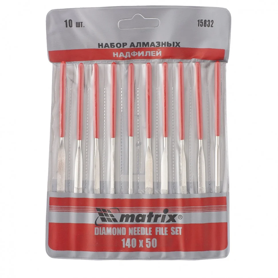 Набор алмазных надфилей Matrix 15832 из 10 шт., 140 х 50 х 3 мм, предназначен для точных работ и используется для доводки и зачистки мелких деталей. Подходит для обработки металлических, стеклянных, керамических поверхностей. Набор универсален, т.к. в него входят надфили с разными сечениями профилей, что позволяет опиливать ровные поверхности, а также углы, пазы, отверстия, округлые выступы. Надфили пригодятся в слесарном деле, при занятиях моделированием, будут полезны и в быту.ПреимуществаНадфили изготовлены из высокоуглеродистой стали, поэтому характеризуются твердостью и износостойкостью.Напыление из алмазной крошки обеспечивает высокие абразивные свойства надфилей.Рукоятки обрезинены и не скользят в руке, что повышает комфорт по время работы.Красный цвет рукояток хорошо заметен, поэтому инструменты не затеряются в рабочем пространстве.