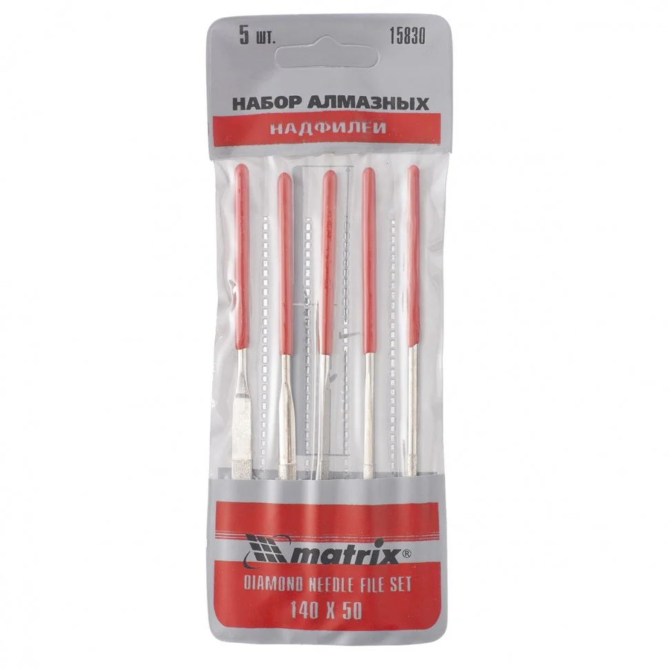 Набор алмазных надфилей Matrix 15830 из 5 шт., 140 х 50 х 3 мм, предназначен для точных работ и используется для доводки и зачистки мелких деталей. Подходит для обработки металлических, стеклянных, керамических поверхностей. Набор универсален, т.к. в него входят надфили с разными сечениями профилей, что позволяет опиливать ровные поверхности, а также углы, пазы, округлые выступы. Надфили пригодятся в слесарном деле, при занятиях моделированием, будут полезны и в быту.ПреимуществаНадфили изготовлены из высокоуглеродистой стали, поэтому характеризуются твердостью и износостойкостью.Напыление из алмазной крошки обеспечивает высокие абразивные свойства надфилей.Рукоятки обрезинены и не скользят в руке, что повышает комфорт по время работы.Красный цвет рукояток хорошо заметен, поэтому инструменты не затеряются в рабочем пространстве.