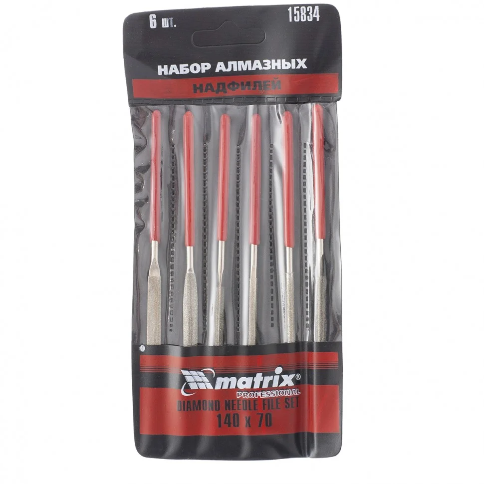 Набор алмазных надфилей Matrix 15834 из 6 шт., 140 х 70 х 3 мм, предназначен для точных работ и используется для доводки и зачистки мелких деталей. Подходит для обработки металлических, стеклянных, керамических поверхностей. Набор универсален, т.к. в него входят надфили с разными сечениями профилей, что позволяет опиливать ровные поверхности, а также углы, пазы, отверстия, округлые выступы. Надфили пригодятся в слесарном деле, при занятиях моделированием, будут полезны и в быту.ПреимуществаНадфили изготовлены из высокоуглеродистой стали, поэтому характеризуются твердостью и износостойкостью.Напыление из алмазной крошки обеспечивает высокие абразивные свойства надфилей.Рукоятки обрезинены и не скользят в руке, что повышает комфорт по время работы.Красный цвет рукояток хорошо заметен, поэтому инструменты не затеряются в рабочем пространстве.
