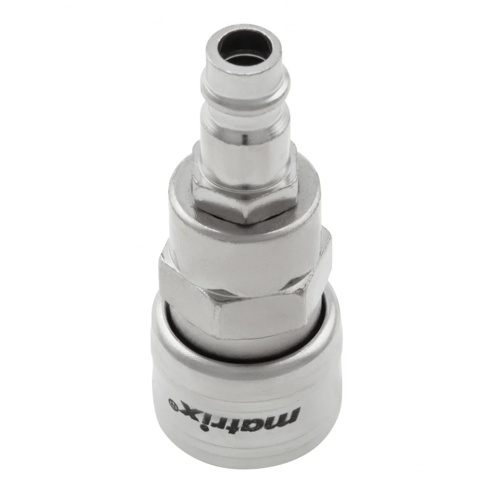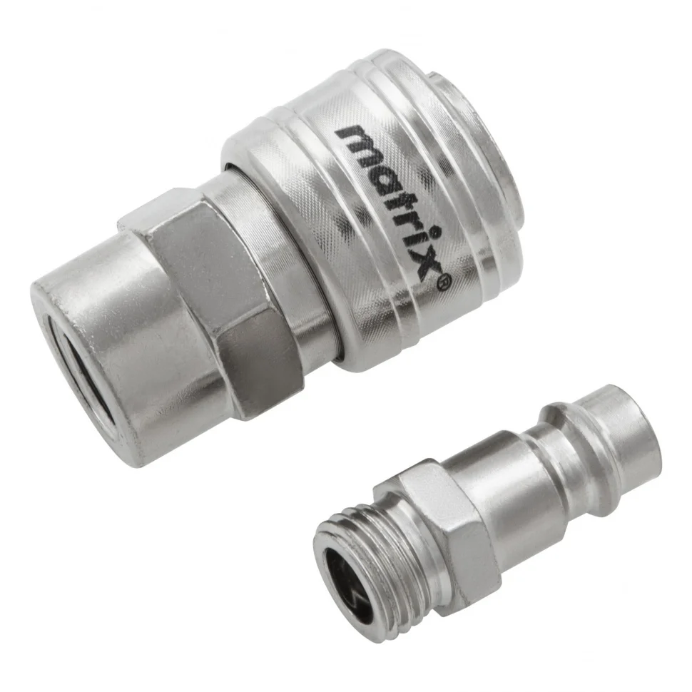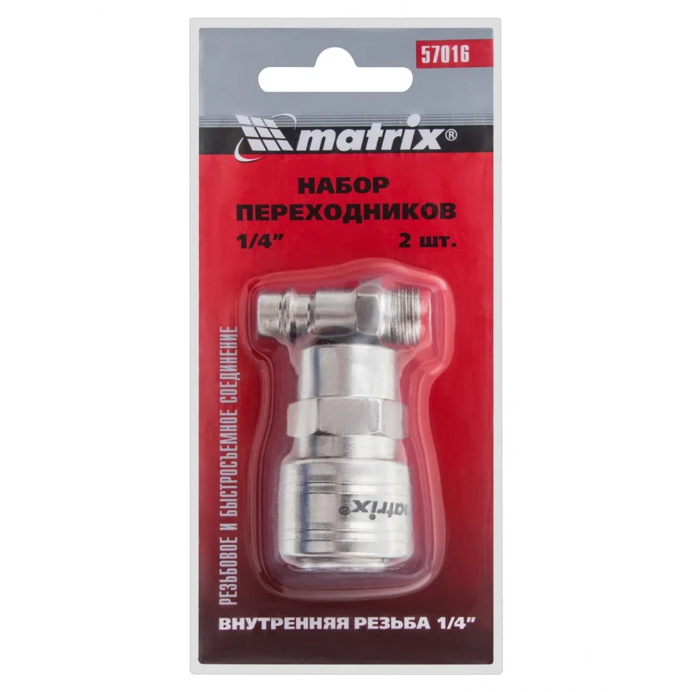 Набор переходников Matrix 57016 обеспечивает подключение элементов пневмосистемы с разным типом крепления. Он позволяет просто перейти с быстросъемного соединения на резьбовое и надежно соединить компрессор с пневматическим инструментом.Набор состоит из двух аксессуаров: ниппеля Rapid (Euro) типа «папа» и муфты Rapid (Euro) типа «мама» с диаметром внутренней резьбы 1/4″.Преимущества:Износостойкость — прочная сталь обеспечивает высокие эксплуатационные качества переходников.Антикоррозийное покрытие — ниппель и муфта защищены от разрушения.Удобное хранение — переходники поставляются в блистере