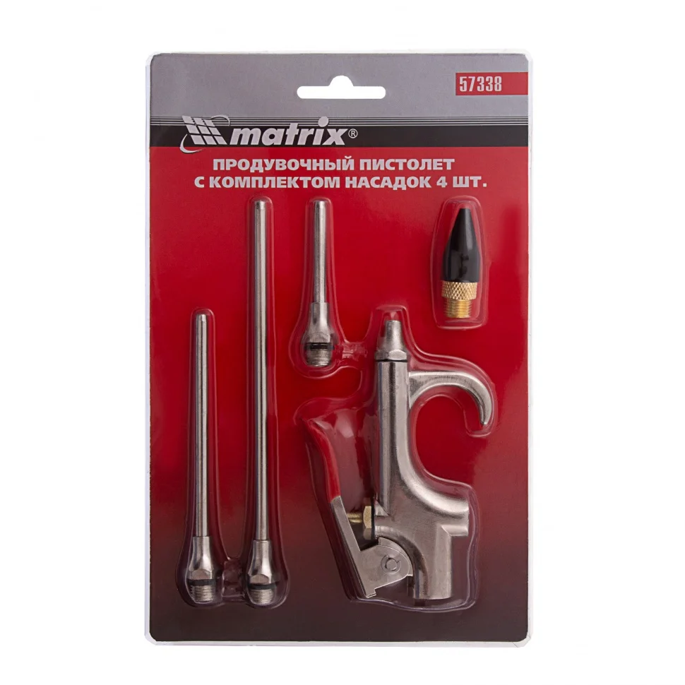 Набор Matrix 57338 включает в себя пневматический пистолет и 4 сопла для продувки как маленьких, так и глубоких отверстий а также больших поверхностей. Струя сжатого до 6 бар воздуха выходит со скоростью до 400 л/мин, что позволяет использовать пистолет в быту, во время ремонта и строительства, в автосервисах и небольших мастерских.Благодаря низкой пожаро- и взрывоопасности пневматический пистолет можно эксплуатировать во влажных помещениях.Преимущества:3 сопла разной длины обеспечивают очищение от скопившейся грязи даже в труднодоступных местах.Конусообразная насадка с пластичным резиновым соплом герметично соединяется с обрабатываемым отверстием/шлангом и позволяет прочистить его максимально эффективно.Металлический корпус продлевает срок службы пневмопистолета, т.к. не боится падений и механических повреждений.Механизм, открывающий и перекрывающий подачу воздуха, отличается высокой надежностью и не сломается даже спустя годы эксплуатации.Небольшой крючок позволяет подвесить пневмопистолет на время перерыва.Вес пистолета без насадки составляет всего 156 грамм, поэтому мастер будет работать без усталости, не перенапрягая руку.