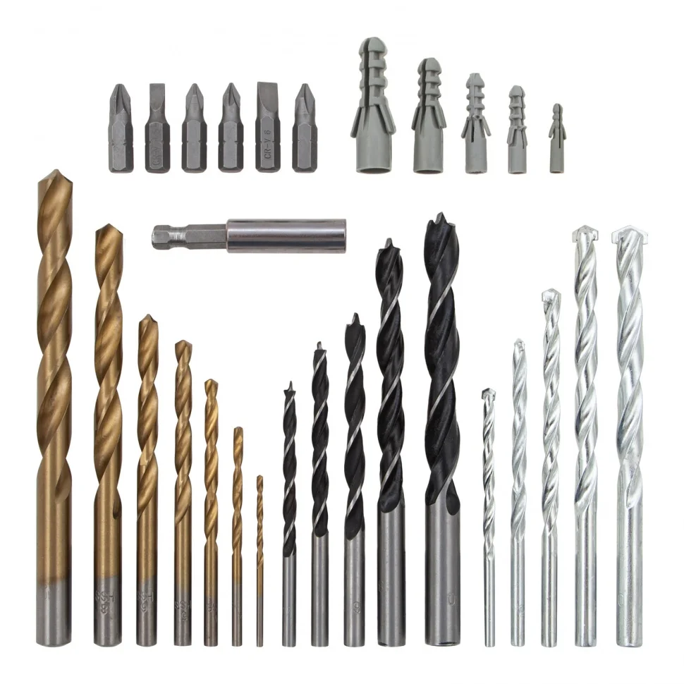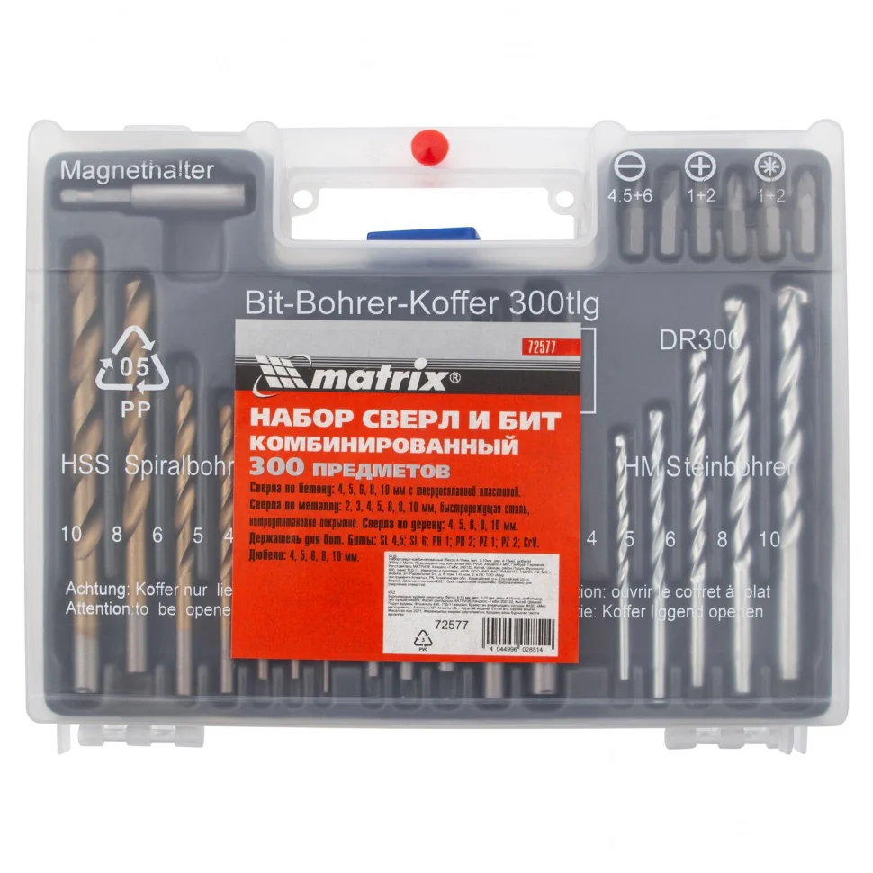 Комбинированный набор Matrix PRO 72577 — это универсальное решение для мастеров, т.к. он содержит 300 предметов: отверточные биты, сверла по дереву 4-10 мм, сверла по бетону 4-10 мм и сверла металлу 2-10 мм. Оснастка рассчитана на бытовое использование.ПреимуществаКачественное исполнение и высокий ресурс — биты выполнены из стали 45Х, сверла по дереву — из углеродистой стали, а сверла по металлу — из быстрорежущей стали HSS.Долговечность и износостойкость — сверла по бетону изготовлены из стали 40Х и имеют твердосплавную пластину ВК6.Универсальность — благодаря цилиндрическим хвостовикам сверла подходят для большинства дрелей и шуруповертов.Быстрая смена бит — магнитный адаптер позволяет легко переключаться между задачами.Удобный набор — оснастка наиболее распространенных размеров позволяет выполнить большинство задач в быту.Пластмассовый пенал — набор удобно перевозить и хранить.