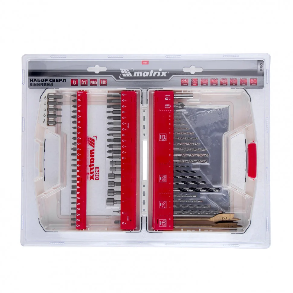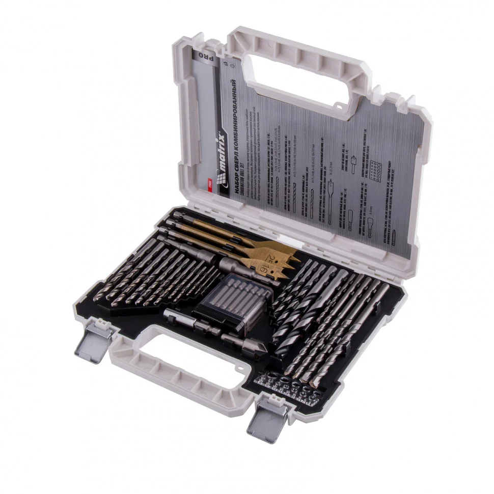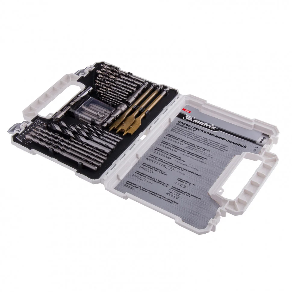 Комбинированный набор Matrix 725650 — это универсальное решение для мастеров, т.к. он содержит 50 предметов: отверточные биты (22 шт.) и адаптер к ним, зенковку, 2 торцевые головки, измерительную шкалу, сверла по дереву 4-10 мм, сверла по бетону 4-8 мм и сверла металлу 1-6,5 мм. Оснастка соответствует высоким стандартам качества, поэтому рассчитана как на использование в быту, так и на решение профессиональных задач.ПреимуществаКачественное исполнение деталей набора гарантирует их высокий ресурс: адаптер и торцевые головки выполнен из стали CrV, сверла по металлу из стали Р6М5, а сверла по дереву — из стали 45.Сверла по бетону характеризуются долговечностью и износостойкостью, т.к. изготовлены из стали 40Х и имеют твердосплавную пластину ВК8.Биты из прочной стали CrV имеют высокий ресурс и стойкость к коррозии.Благодаря цилиндрическим хвостовикам сверла подходят для большинства дрелей и шуруповертов.Магнитный адаптер позволяет легко и быстро менять биты, что удобно при работе с различными насадками.В наборе содержатся инструменты наиболее распространенных размеров, поэтому с ним можно выполнить большинство работ.Комплектующие набора размещены в эргономичном пластиковом кейсе с защелками и ручкой для их безопасной транспортировки и удобного хранения.