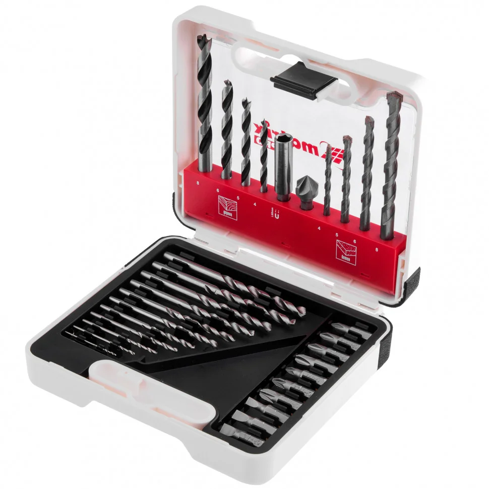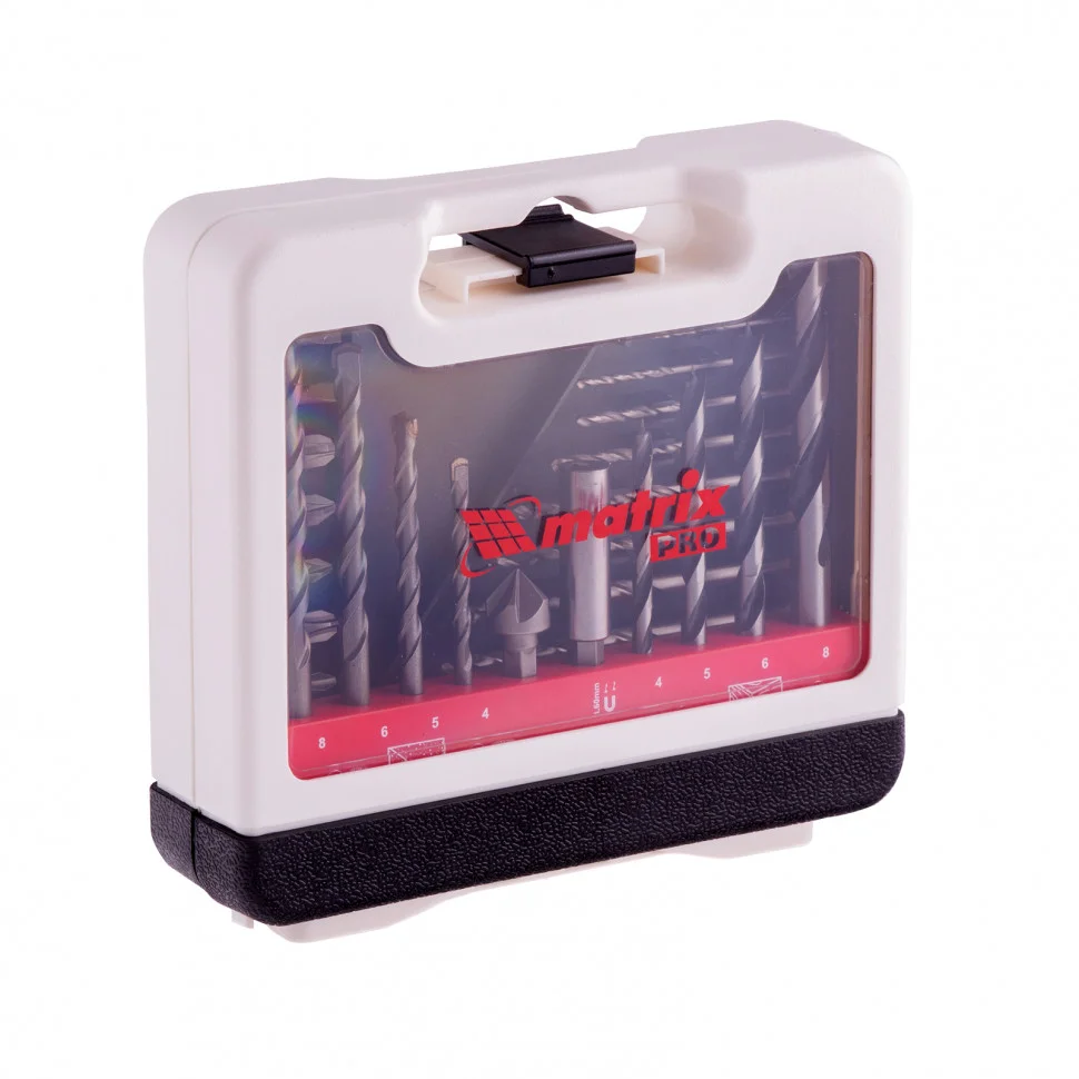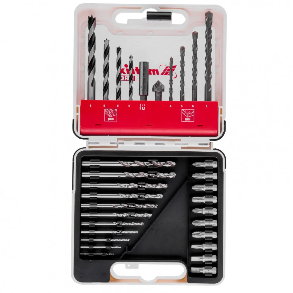 Комбинированный набор Matrix PRO 725631 — это универсальное решение для мастеров, т.к. он содержит 31 предмет: отверточные биты (10 шт.) и адаптер к ним, зенковку и сверла по дереву 4-8 мм, сверла по бетону 4-8 мм и сверла металлу 1-6 мм. Оснастка соответствует высоким стандартам качества, поэтому рассчитана как на использование в быту, так и на решение профессиональных задач.ПреимуществаКачественное исполнение деталей набора гарантирует их высокий ресурс: торцевые головки и зенковка выполнены из углеродистой стали, сверла по металлу из стали Р6М5, а сверла по дереву — из стали 45.Сверла по бетону характеризуются долговечностью и износостойкостью, т.к. изготовлены из стали 40Х и имеют твердосплавную пластину ВК8.Биты из прочной стали CrV имеют высокий ресурс и стойкость к коррозии.Благодаря цилиндрическим хвостовикам сверла подходят для большинства дрелей и шуруповертов.Магнитный адаптер позволяет легко и быстро менять биты, что удобно при работе с различными насадками.В наборе содержатся инструменты наиболее распространенных размеров, поэтому с ним можно выполнить большинство работ.Комплектующие набора размещены в эргономичном пластиковом кейсе с ручкой и защелкой для их безопасной транспортировки и удобного хранения.