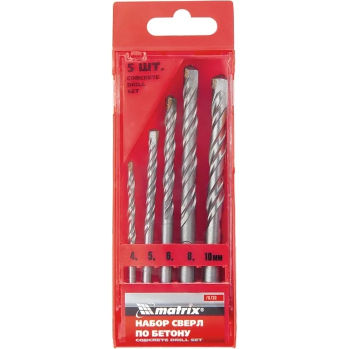 Набор Matrix 70730 включает в себя 5 сверл диаметром 4-5-6-8-10 мм в пластиковом кейсе для получения отверстий в твердых материалах: бетоне, керамике, мраморе и т.д. Он рассчитан на интенсивное использование как в быту, так и на строительной площадке.ПреимуществаГарантией качества набора выступает сталь 40Х твердостью 44-48 HRC, из которой выполнены сверла.Твердосплавная пластина ВК8 обеспечивает высокий ресурс оснастки.Набор содержит оснастку наиболее распространенных размеров, что позволяет выполнять большинство сверлильных работ.Каждое из сверл имеет трехгранный хвостовик, поэтому они не проворачиваются в патроне.Канавки сверл с двойной спиралью обеспечивают эффективный отвод продуктов сверления.Пластиковый кейс с подвесом позволяет компактно хранить и транспортировать набор.