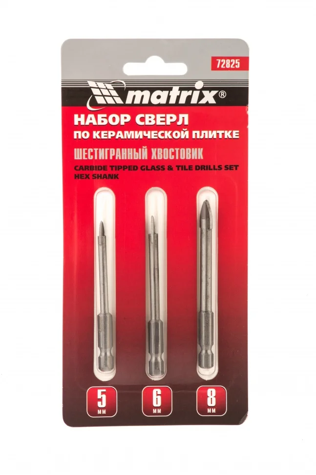 Набор сверл по керамической плитке, 5-6-8 мм, шестигранный хвостовик Matrix 72825
