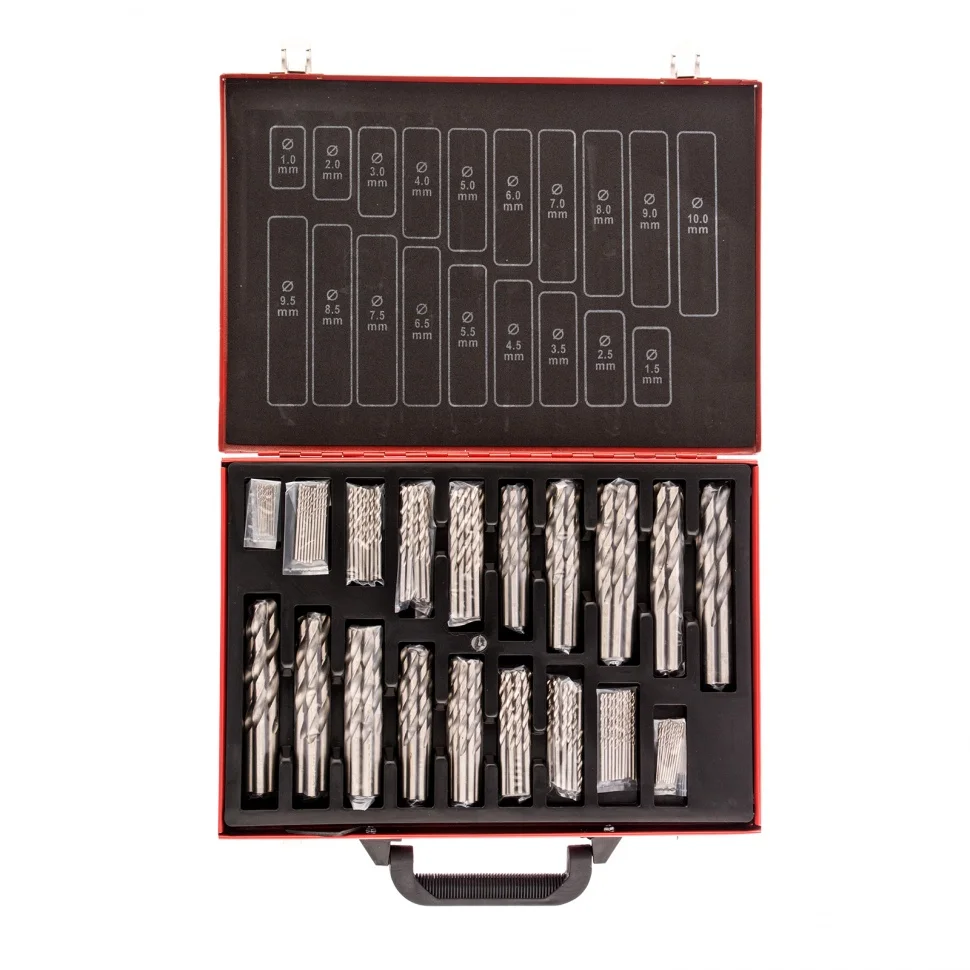 Набор сверл Matrix 723170, 170 шт. из стали HSS, включает в себя оснастку по металлу диаметром 1-10 мм, упакованную в металлический кейс. Пригодится частным мастерам в быту и профессионалам на строительной площадке. Угол заточки сверл составляет 118 градусов, поэтому они подходят для обработки черных металлов, стали, чугуна и твердой бронзы.ПреимуществаВсе сверла выполнены из высококачественной быстрорежущей стали HSS.Рабочие кромки закалены до твердости 62-64 HRC, поэтому обладают высокой износостойкостью.Сверла прошли процедуру поэтапного шлифования, благодаря чему имеют высокую степень соответствия заявленным размерам.Оснастка не заклинивает в процессе эксплуатации за счет обратной конусности.Поверхность сверл отполирована, что снижает трение и обеспечивает улучшенный отвод шлама.Сверла оснащены универсальным цилиндрическим хвостовиком, поэтому подходят для дрелей любого типа.Маркировка на кейсе позволяет быстро находить нужное сверло.Набор упакован в металлический кейс с ручкой для удобства транспортировки и упорядоченного хранения.