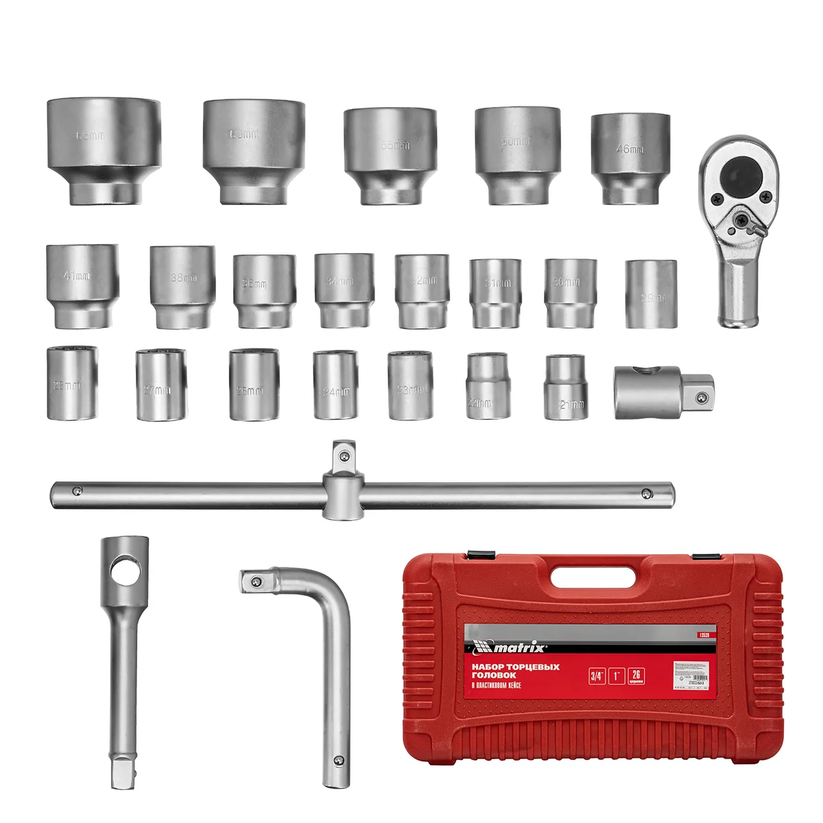 Набор торцевых головок Matrix 13539 с присоединительным квадратом 3/4" и 12-гранным профилем, с переходником на 1", используется для работы с резьбовыми крепежными элементами размером от 21 до 65 мм. Переходник с 3/4 на 1" расширяет возможности применения набора. Торцевые головки применяются для ремонта и обслуживания автобусов и грузовых автомобилей.