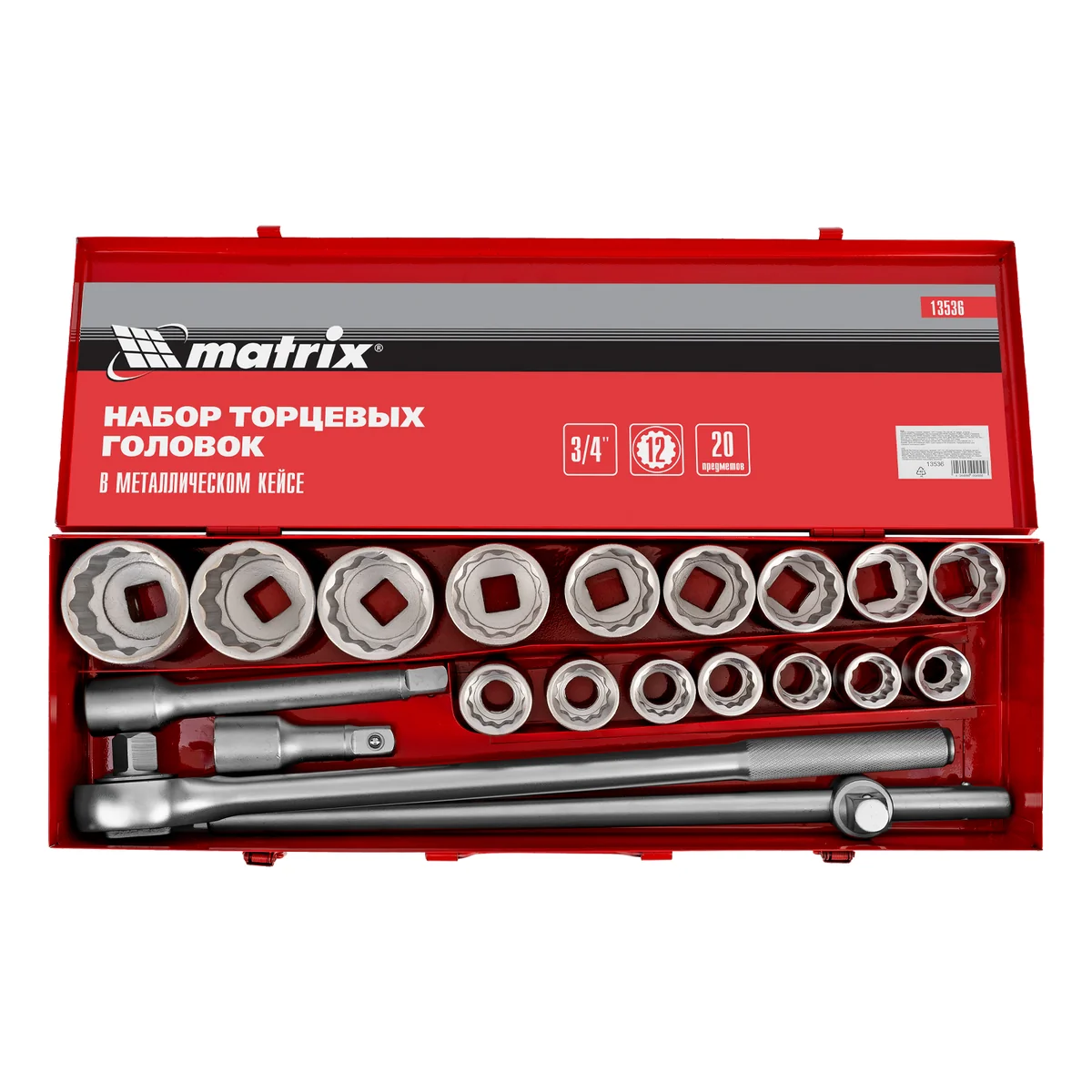 Набор торцевых головок Matrix 13536 с присоединительным квадратом 3/4" и 12-гранным профилем используется для работы с резьбовыми крепежными элементами размером от 19 до 50 мм. Применяется для ремонта и обслуживания автобусов и грузовых автомобилей.