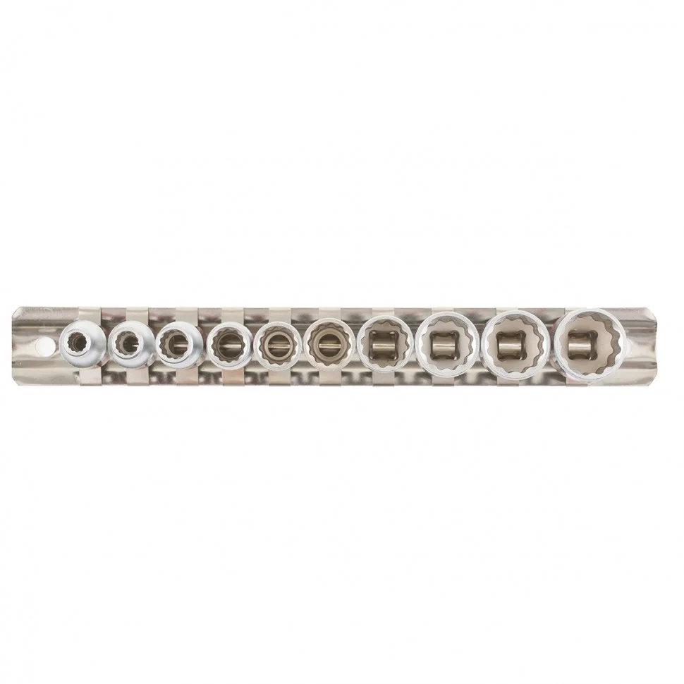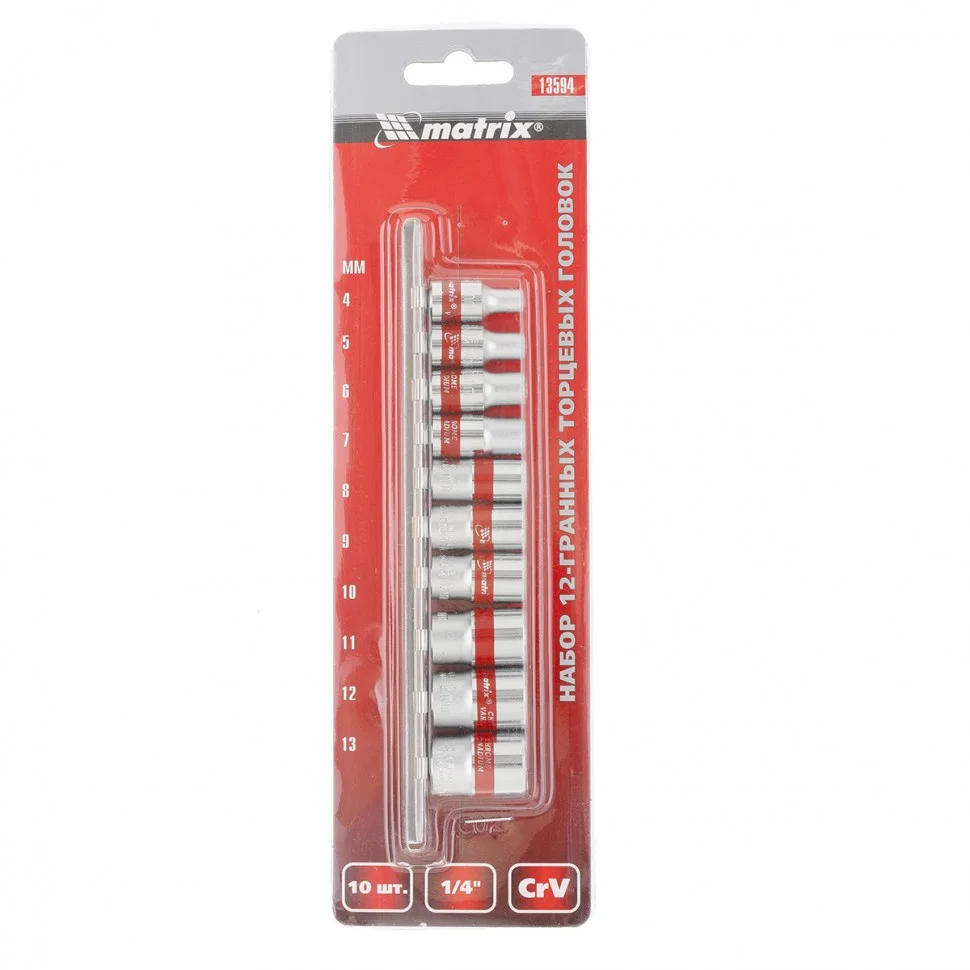 Набор торцевых головок 1/4 дюйма Matrix 13594 с 12-гранным профилем, CrV, 10 шт., 4-13 мм, предназначен для работы с небольшими резьбовыми соединениями. Насадки будут полезны автовладельцам, работникам автосервиса и домашним мастерам.ПреимуществаБлагодаря 12-гранному профилю с головками удобно работать в тесном пространстве - для поворота и перестановки инструмента требуется угол всего 30 градусов.Насадки изготовлены из хромованадиевой стали, рабочие части закалены до твердости 42 HRC, поэтому они обладают высоким рабочим ресурсом.Полированное хромоникелевое покрытие обеспечивает защиту от образования коррозии.Красные полоски на корпусах насадок облегчают их поиск.Торцевые головки удобно хранить за счет металлической планки-держателя