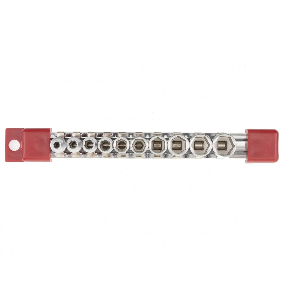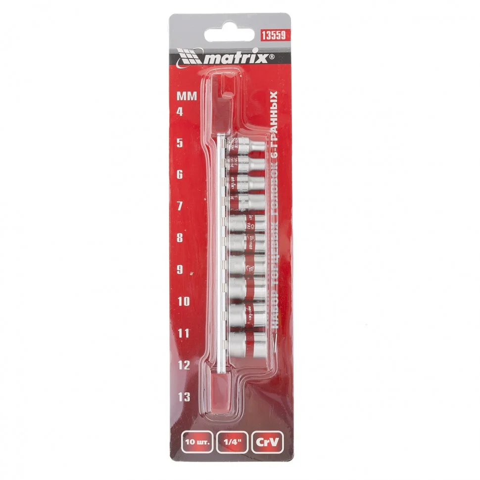 Набор торцевых головок Matrix 13559 с посадочным гнездом 1/4 дюйма и шестигранным профилем, CrV, 10 шт., 4-13 мм, предназначен для работы с резьбовыми соединениями. Он пригодится для бытового ремонта, будет полезен сантехнику, слесарю, авторемонтнику.ПреимуществаВ комплекте 10 насадок диаметром от 4 до 13 мм, которые подходят для работы с мелкими крепежами.Торцевые головки выполнены из хромованадиевой стали, поэтому выдерживают повышенные нагрузки.Полированное хромоникелевое покрытие обеспечивает антикоррозионную стойкость.Для головок предусмотрена плашка-держатель, поэтому они всегда будут под рукой и не потеряются.Ярко-красные полоски позволяют быстро найти нужную торцевую головку в рабочем пространстве.