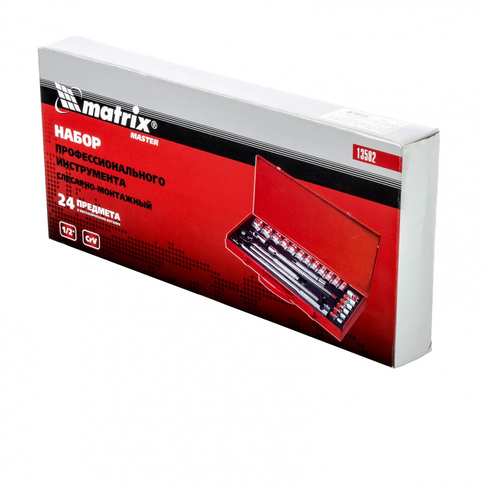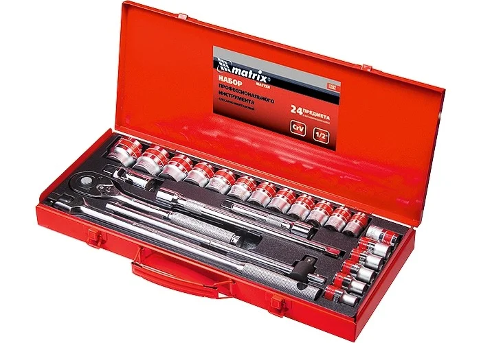 Набор шоферский Matrix 13582 состоит из 24 предметов с присоединительным квадратом 1/2 дюйма, необходимых для проведения слесарно-монтажных работ любой сложности. В него входит 18 шестигранных торцевых головок диаметром от 10 до 32 мм, обеспечивающих решение широкого спектра задач. Набор пригодится автолюбителям и работникам автосервисов.ПреимуществаВоротки, удлинители и шарнирный кардан облегчают работу в труднодоступных местах.Инструменты изготовлены из хромованадиевой стали, что гарантирует их высокую износостойкость, исключительную твердость и прочность.Металлические шариковые фиксаторы исключают риск отсоединения насадок в процессе работы.Удобный металлический кейс с ручкой облегчает хранение и транспортировку набора.