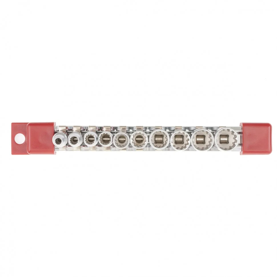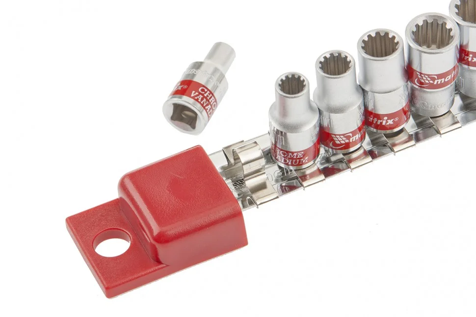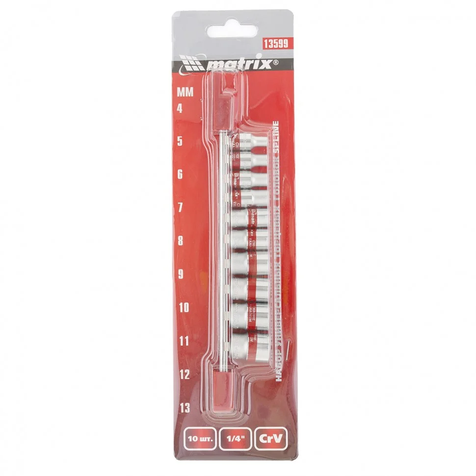 Набор универсальных торцевых головок Matrix 13599 состоит из 10 насадок с посадочным гнездом 1/4 дюйма и 12-гранным профилем Spline. Комплект включает головки размеров от 4 до 13 мм и используется для слесарно-монтажных работ в бытовой и профессиональной сферах.ПреимуществаРабочий профиль Spline подходит для работы с любыми типами крепежей.Насадки обладают высокой стойкостью к износу и интенсивным нагрузкам, поскольку изготовлены из прочной хромованадиевой стали.Полированное хромоникелевое покрытие обеспечивает надежную защиту от коррозии.Металлическая планка-держатель облегчает хранение торцевых головок.Благодаря ярко-красным полоскам ни одна насадка не потеряется.