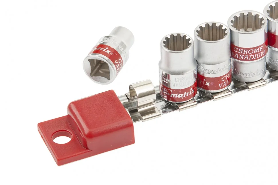 Набор универсальных торцевых головок 3/8 дюйма Matrix 13593 с 12-гранным профилем Spline состоит из 10 насадок 8-19 мм из стали CrV-группы. Они используются для работы с резьбовыми соединениями и подходят для всех видов крепежей. Набор будет полезен дома, на даче или в гараже.ПреимуществаНасадки выдерживают большие нагрузки, т.к. изготовлены из прочной и твердой стали хромованадиевой группы.Торцевые головки служат долго и не ржавеют благодаря полированному хромоникелевому покрытию.Элементы набора хорошо заметны и не потеряются среди других инструментов, поскольку маркированы ярко-красными полосками.Насадки удобно хранить благодаря специальной планке-держателю.